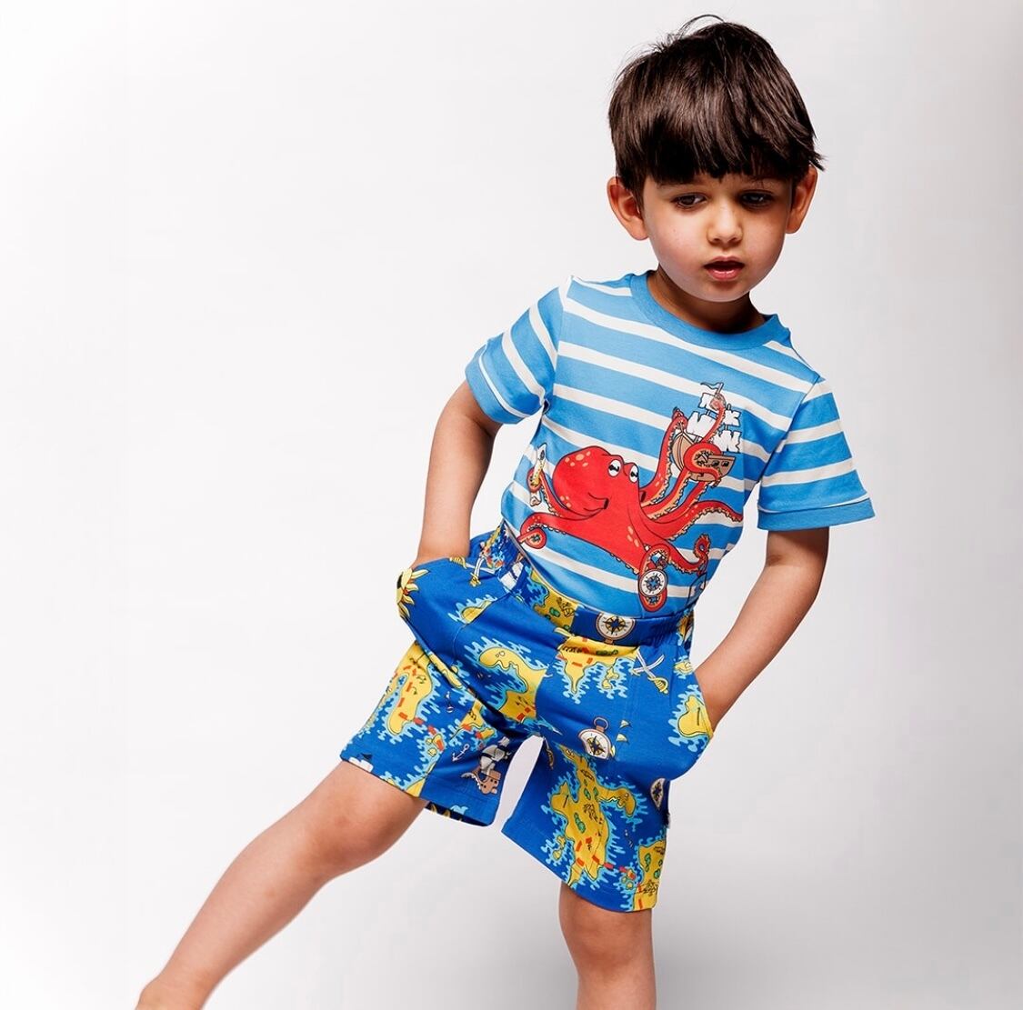 北欧デザインの魅力が詰まったこのブランドは、ビビッドな色遣いとレトロなテキスタイルが特徴です。今回のご紹介は、子供たちの冒険心をくすぐる「海賊の地図」をテーマにしたショートパンツです!