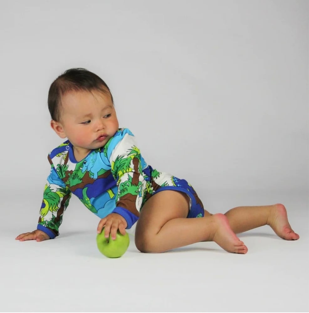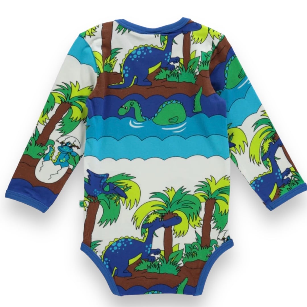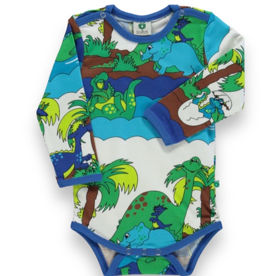Småfolkロングスリーブベビーボディには、愛らしい恐竜柄が施されています!