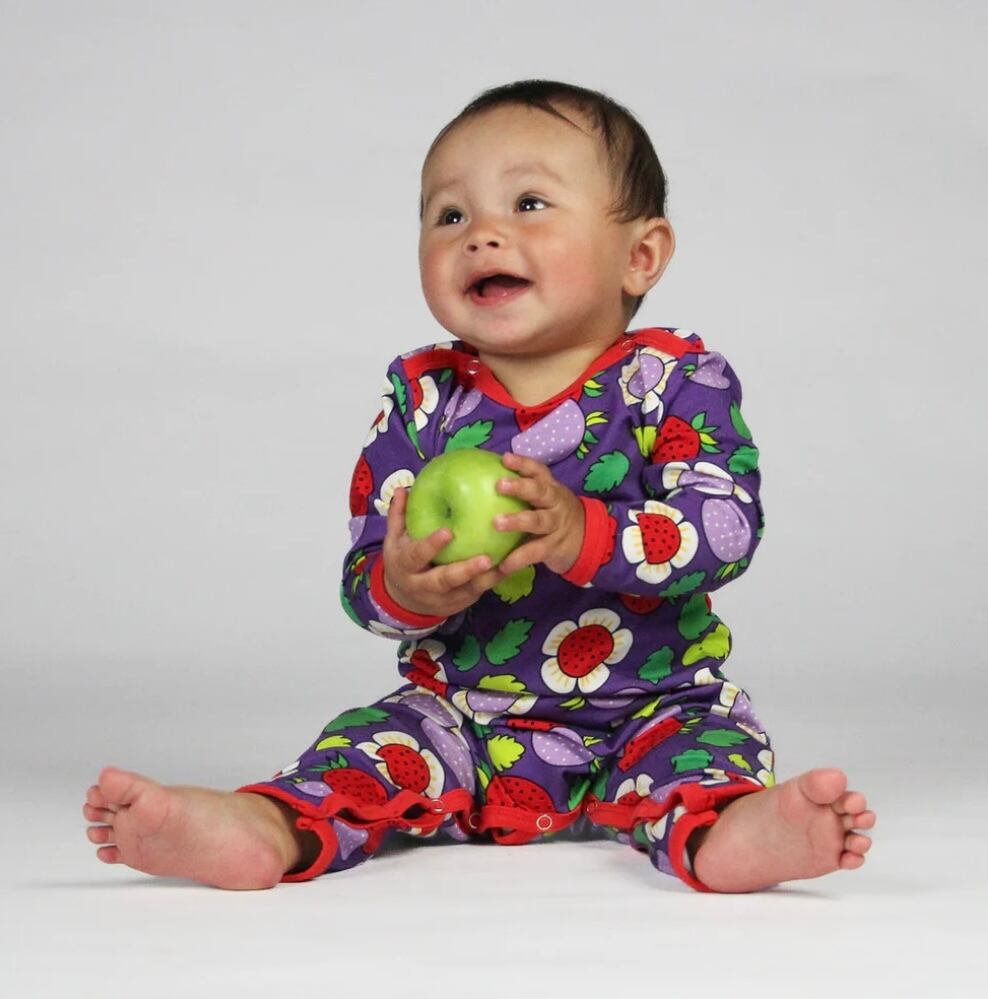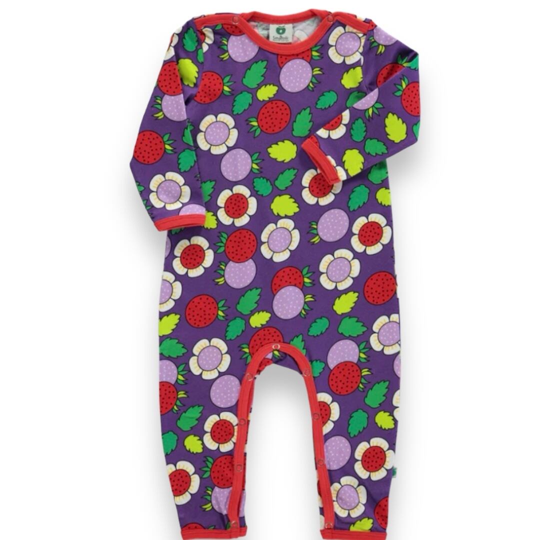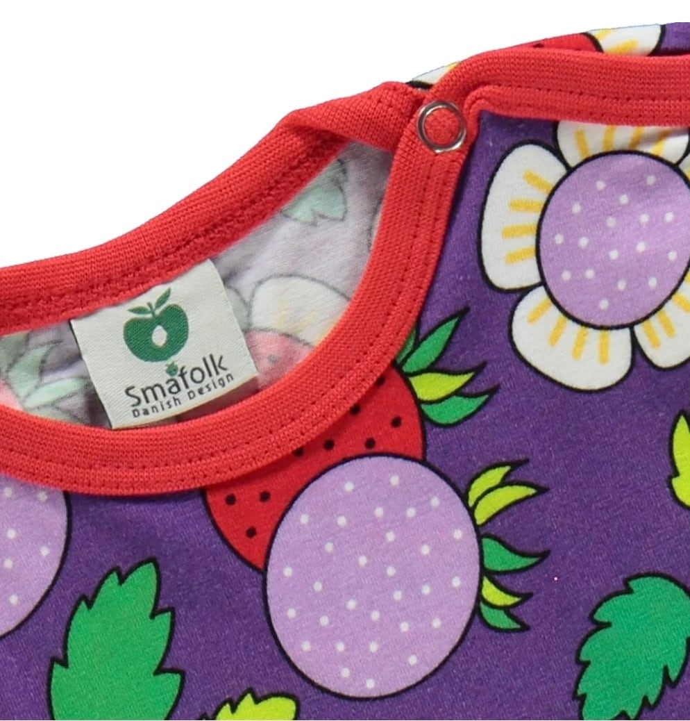 Småfolkのロングスリーブベビースーツは、可愛らしいイチゴ柄が特徴です。赤ちゃんにぴったりの肌触りの良いオーガニックコットンでできており、柔らかく快適な着心地を提供します。ボタンを使った前開きデザインは着替えも簡単で、お出かけ先でも便利なアイテムです!
