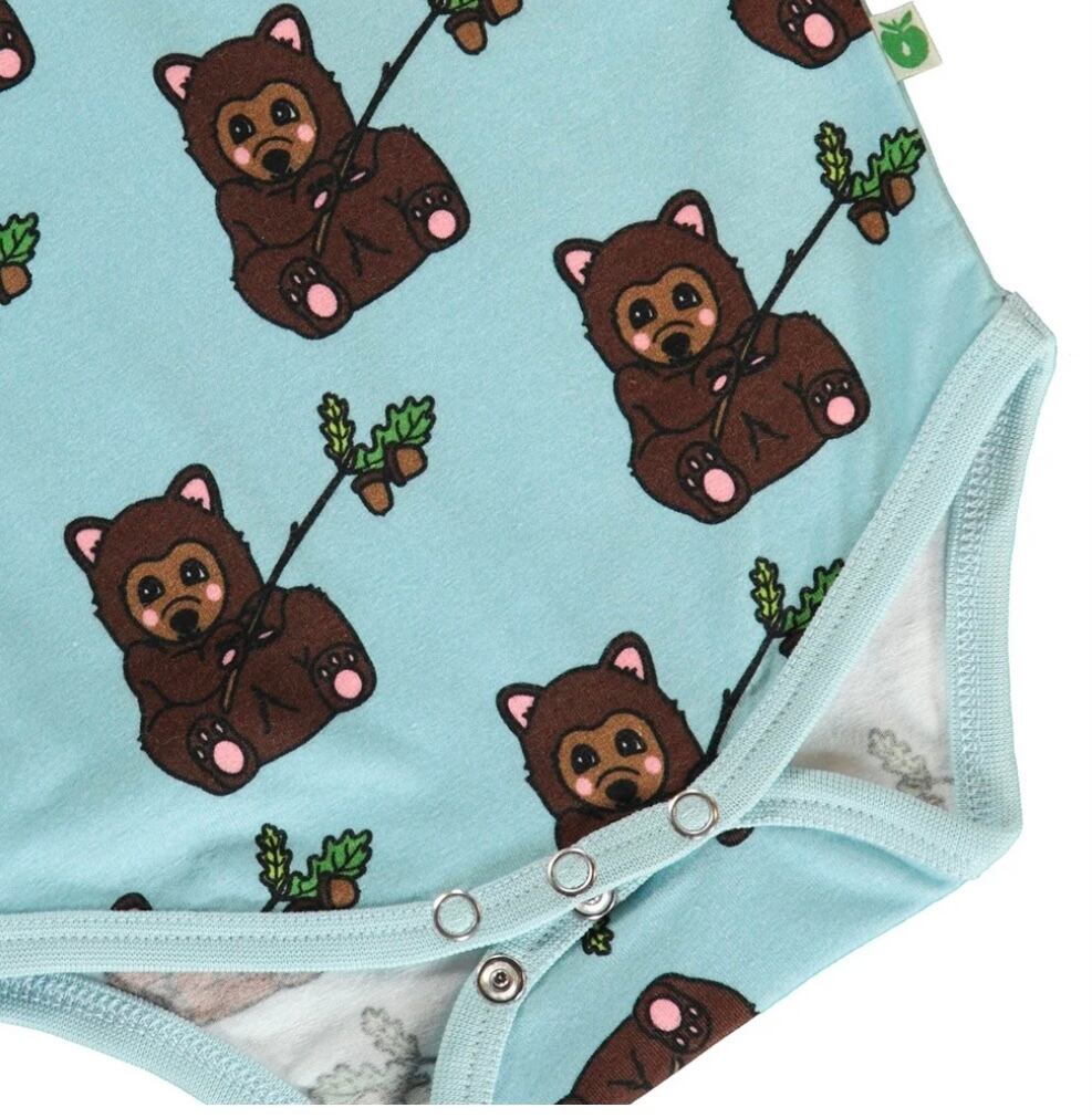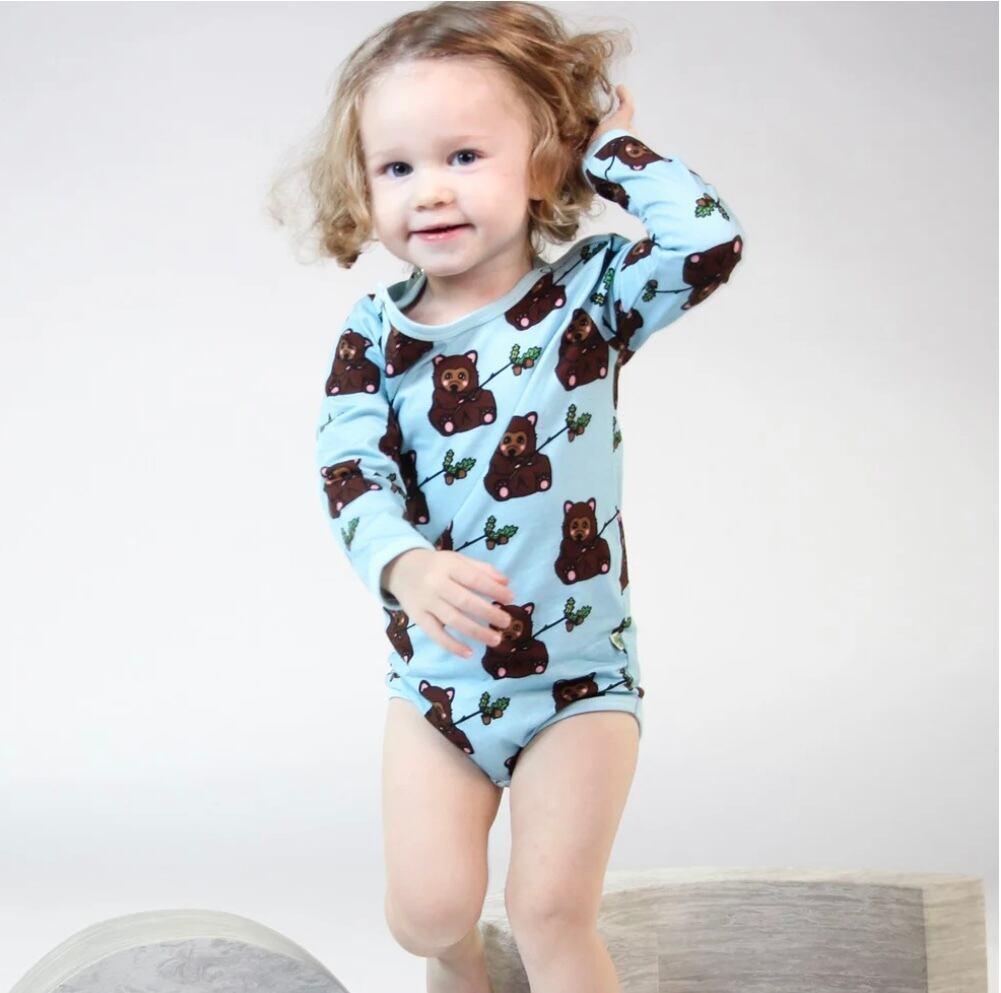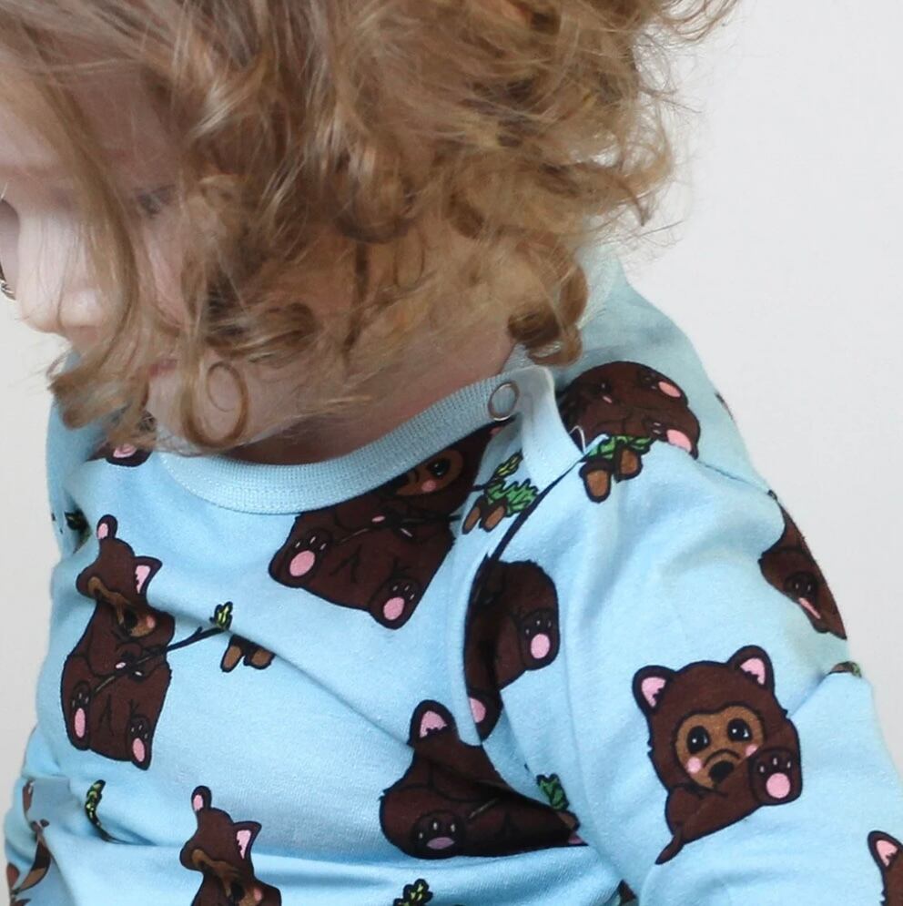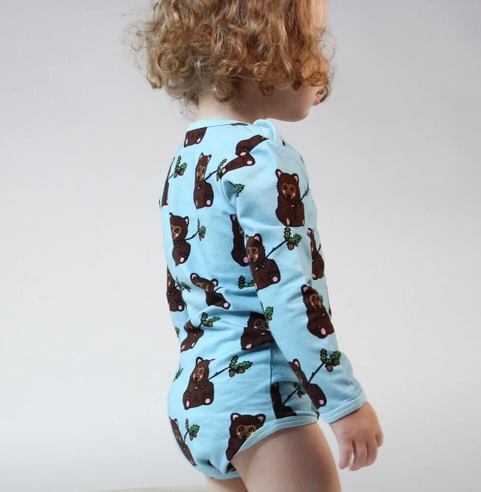 オーガニックで伸縮性のあるコットンジャージーで作られたクマ柄長袖のベビーボディ。