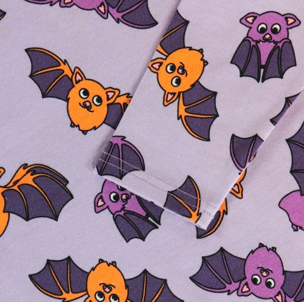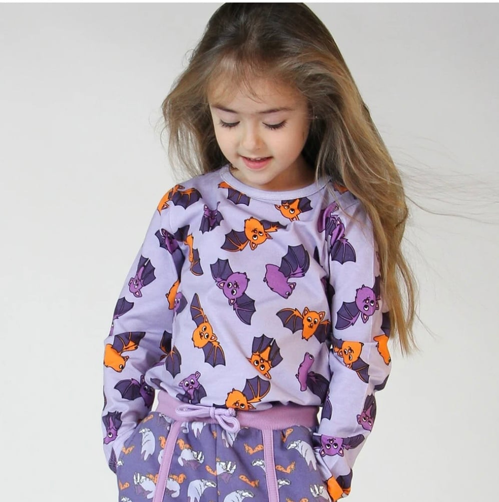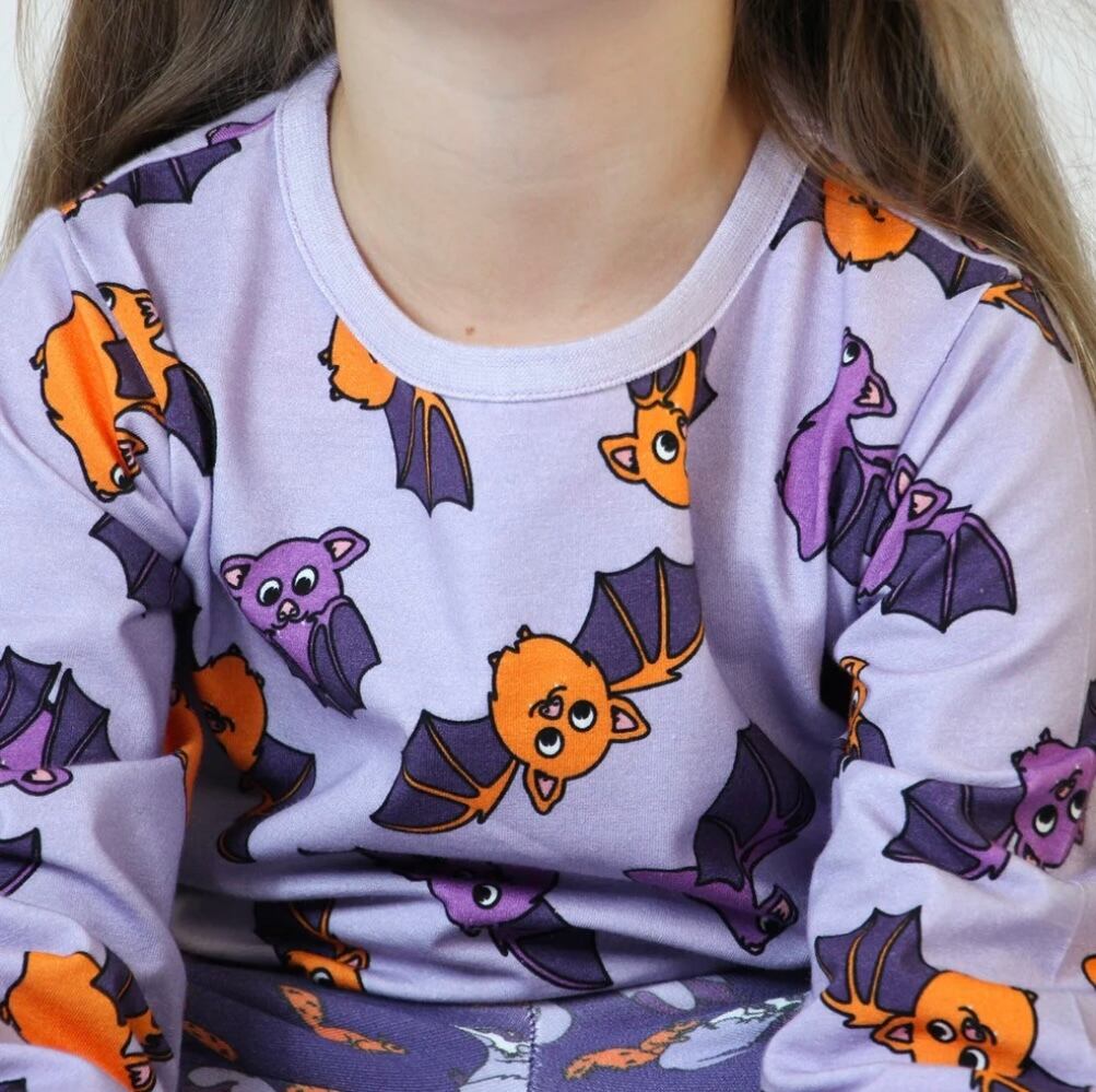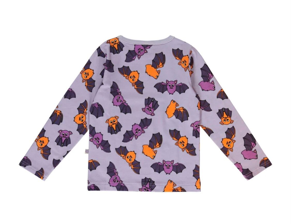 オーガニックで伸縮性のあるコットンジャージーで作られたこうもり柄の長袖Tシャツ。