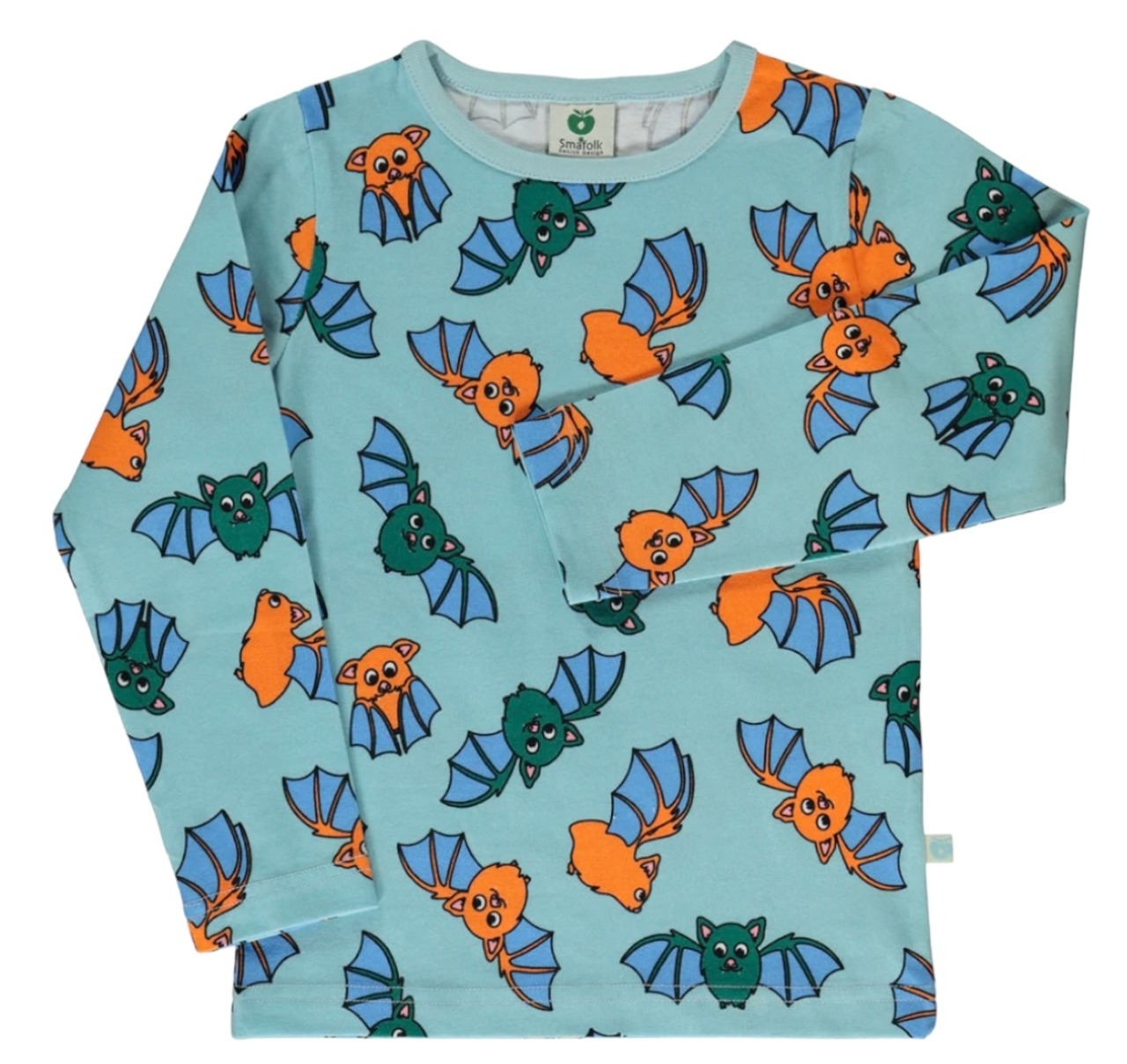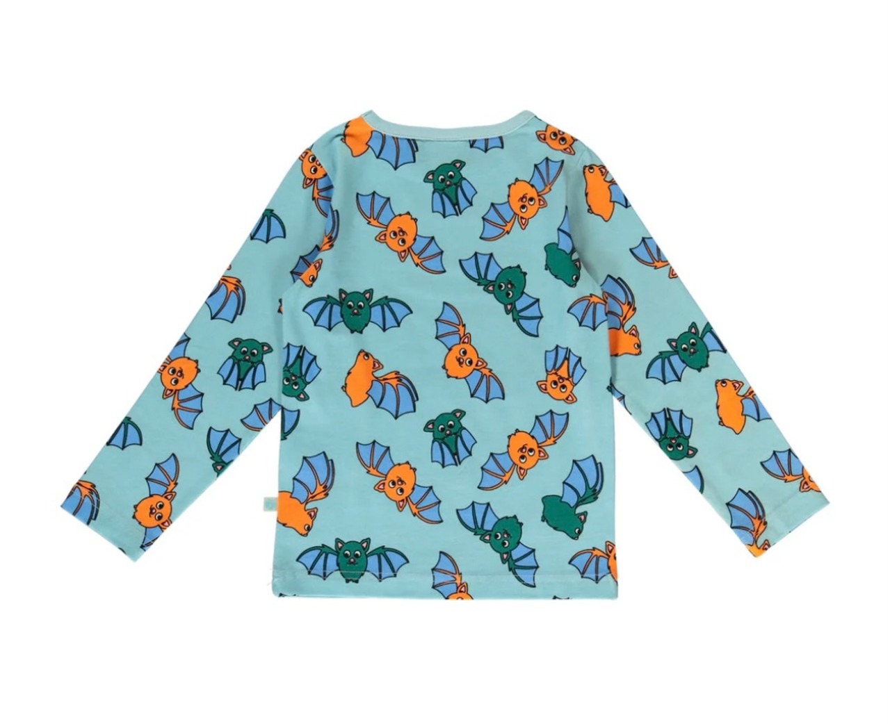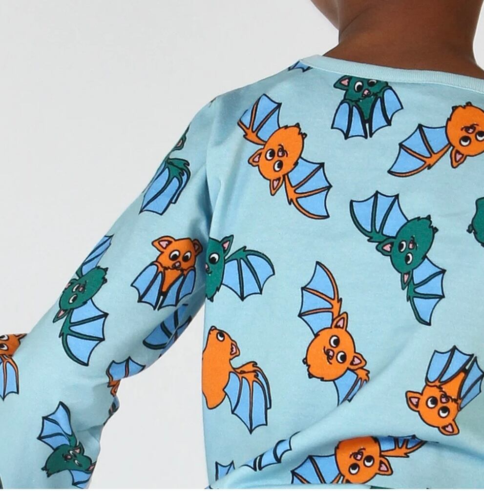 オーガニックで伸縮性のあるコットンジャージーで作られたこうもり柄の長袖Tシャツ。