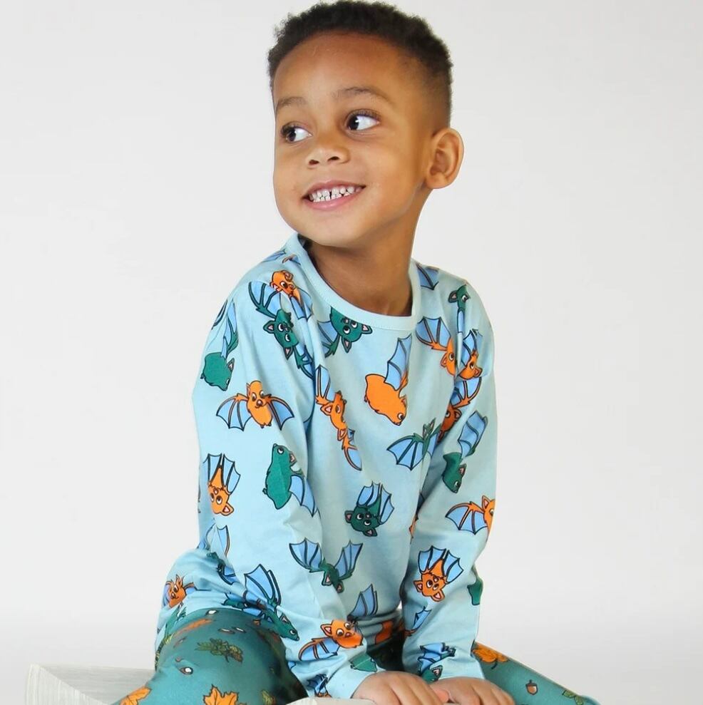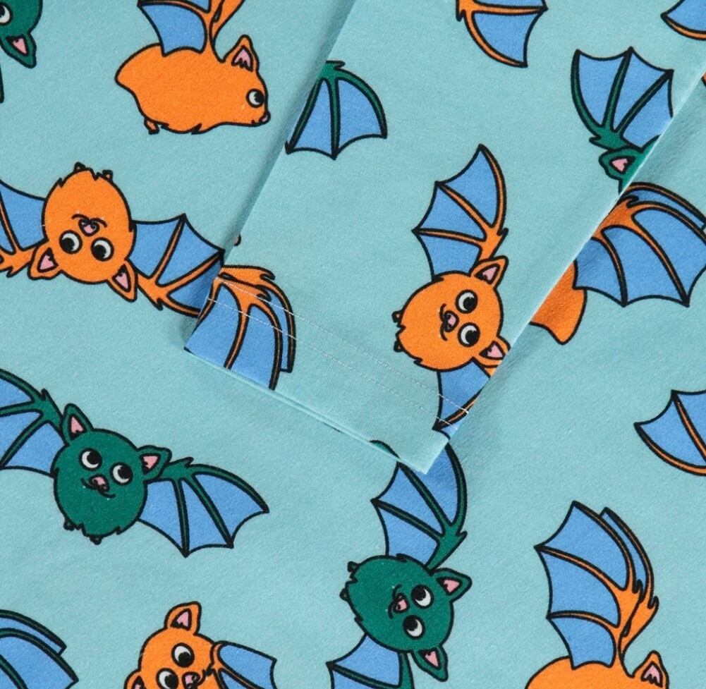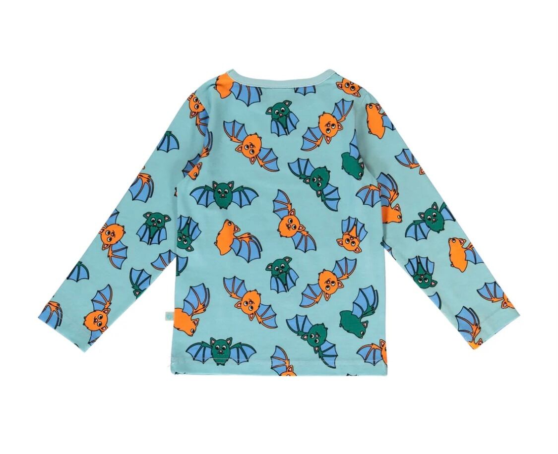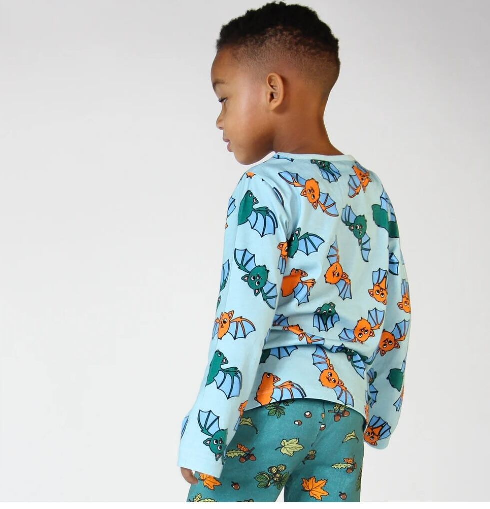 オーガニックで伸縮性のあるコットンジャージーで作られたこうもり柄の長袖Tシャツ。