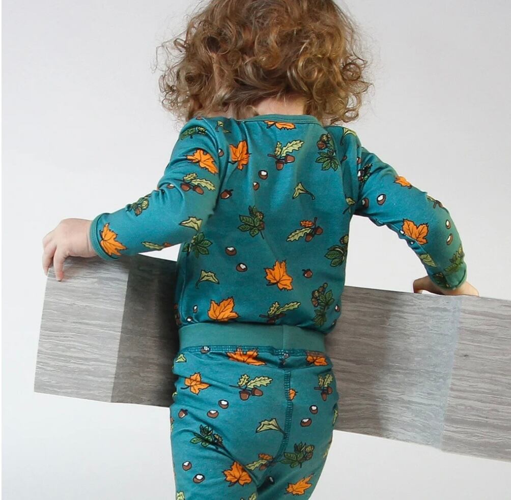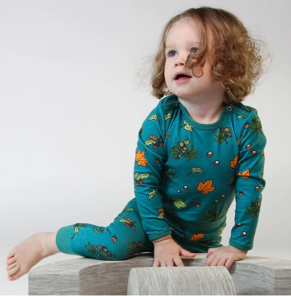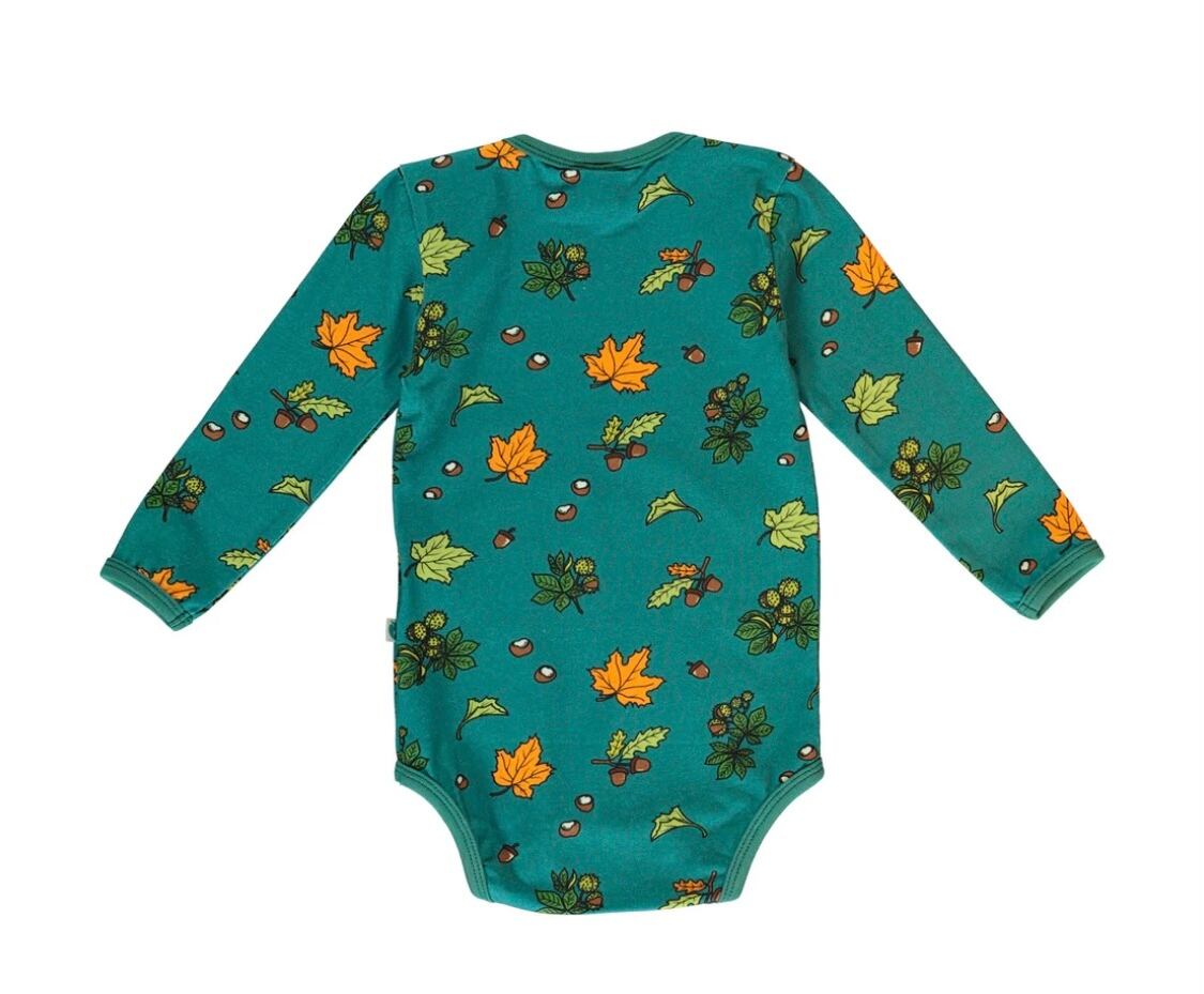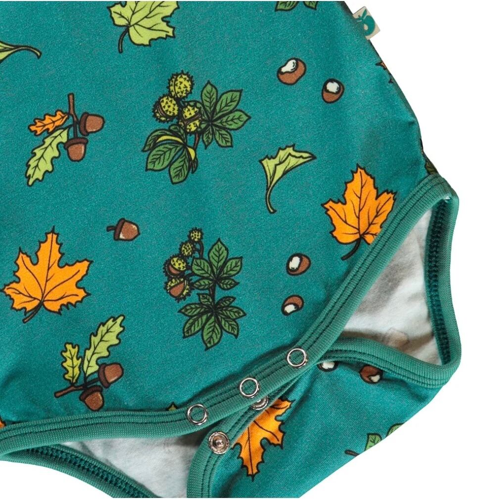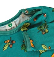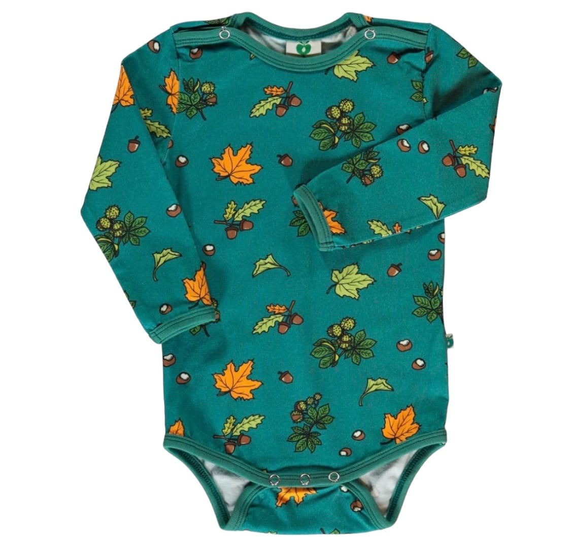 オーガニックで伸縮性のあるコットンジャージーで作られたどんぐり柄の長袖ベビーボディ。
