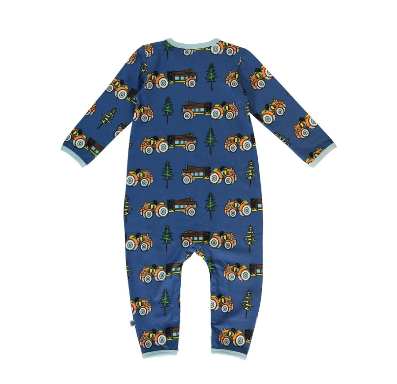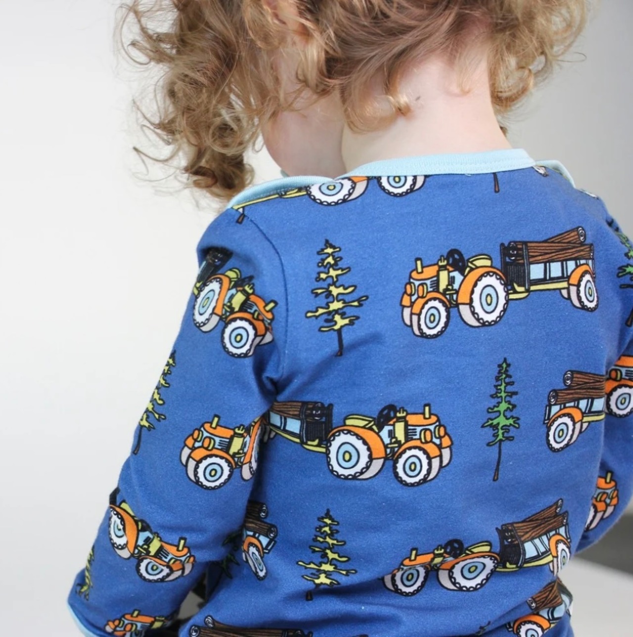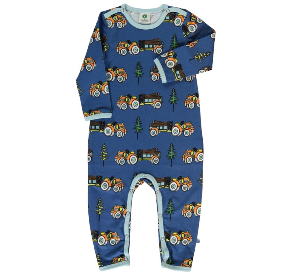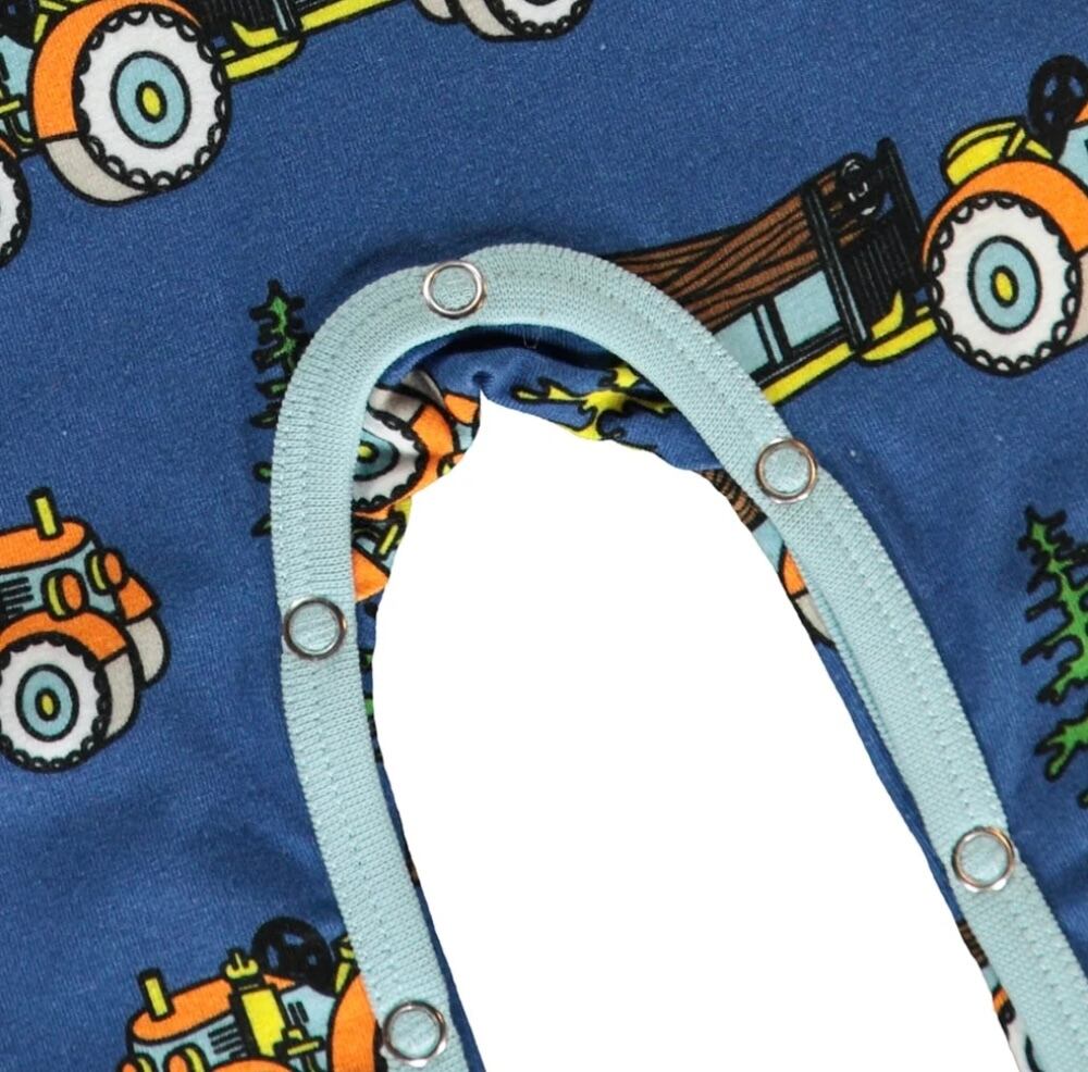 オーガニックで伸縮性のあるコットンジャージーで作られた、トラクター付きのベビースーツ。