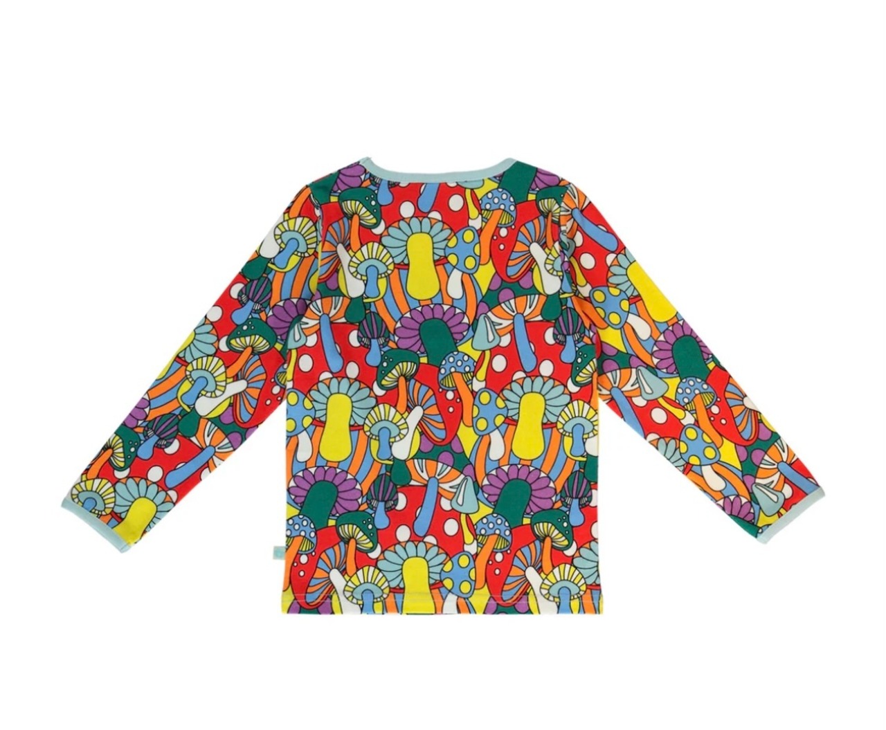オーガニックで伸縮性のあるコットンジャージーで作られたキノコの長袖Tシャツ。このTシャツはOEKO-TEX Standard 100®認定を受けています。つまり、ブラウスは有害物質に対して製造およびテストされているため、お子様の肌と健康をケアできます。