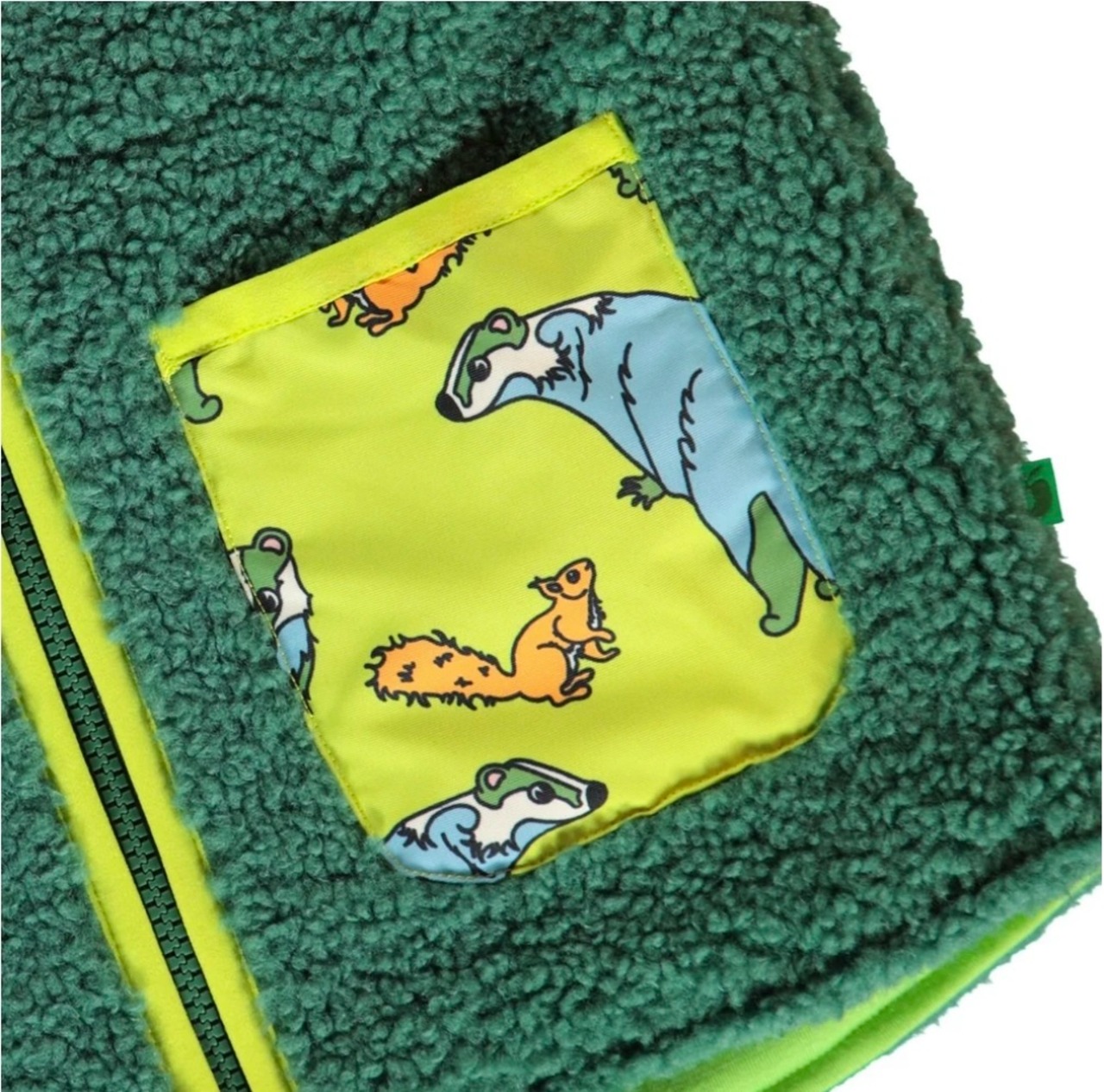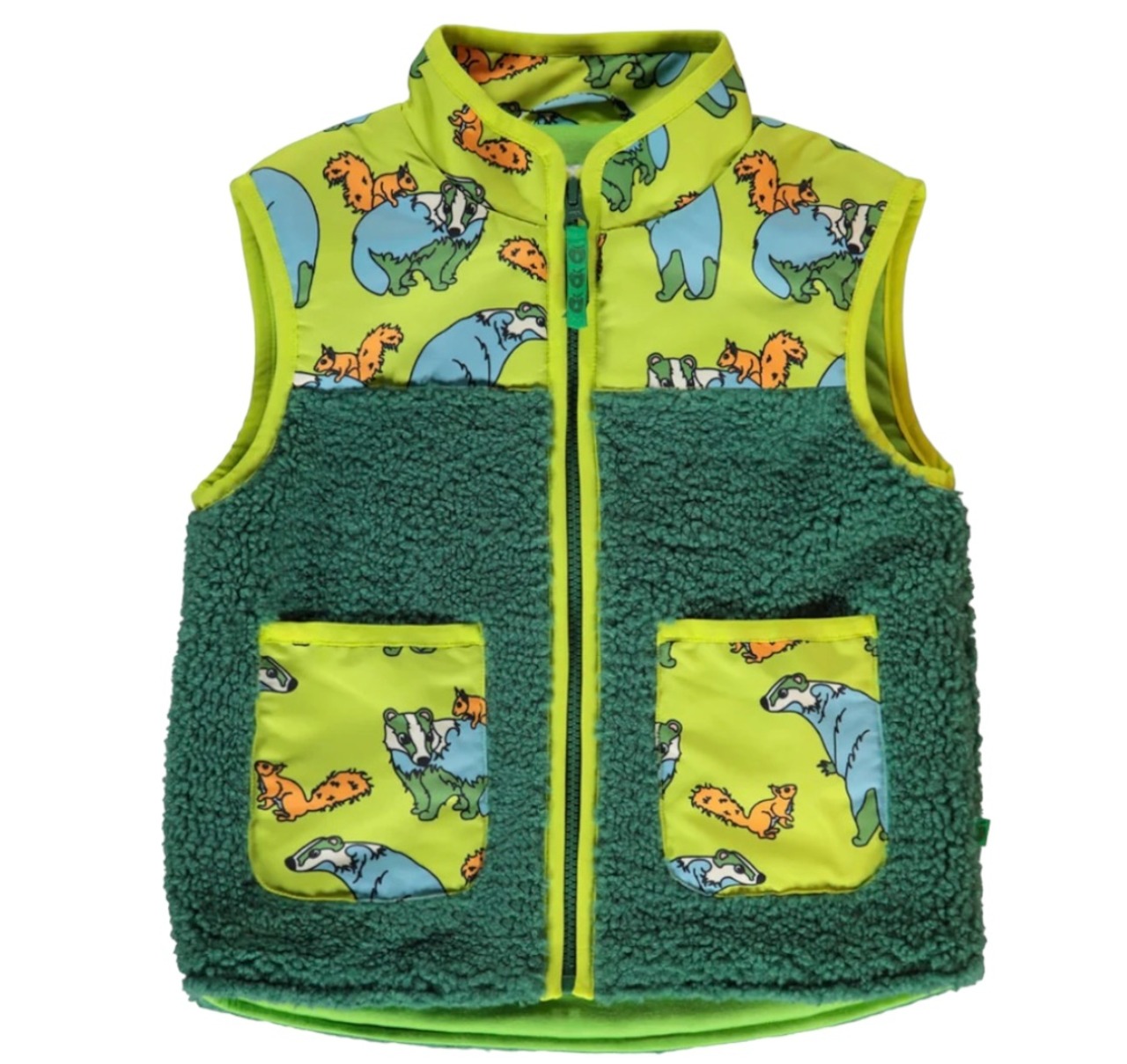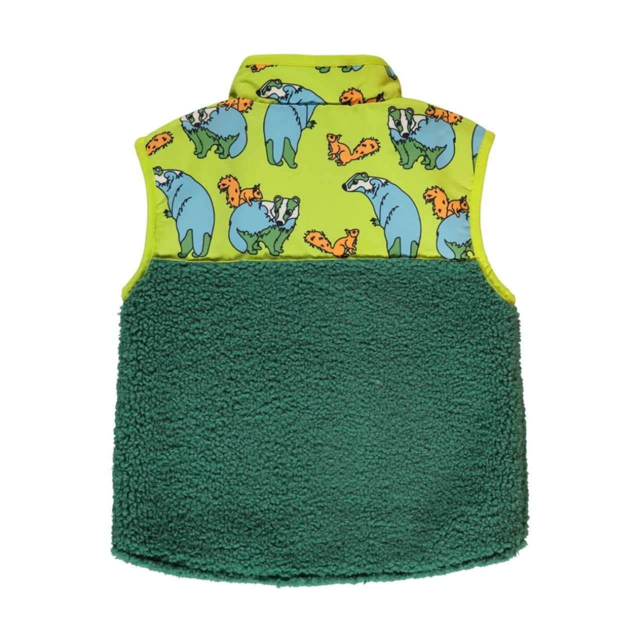 柔らかいテディフリースのベスト、ヨークとポケット、アナグマとリスのプリント。
