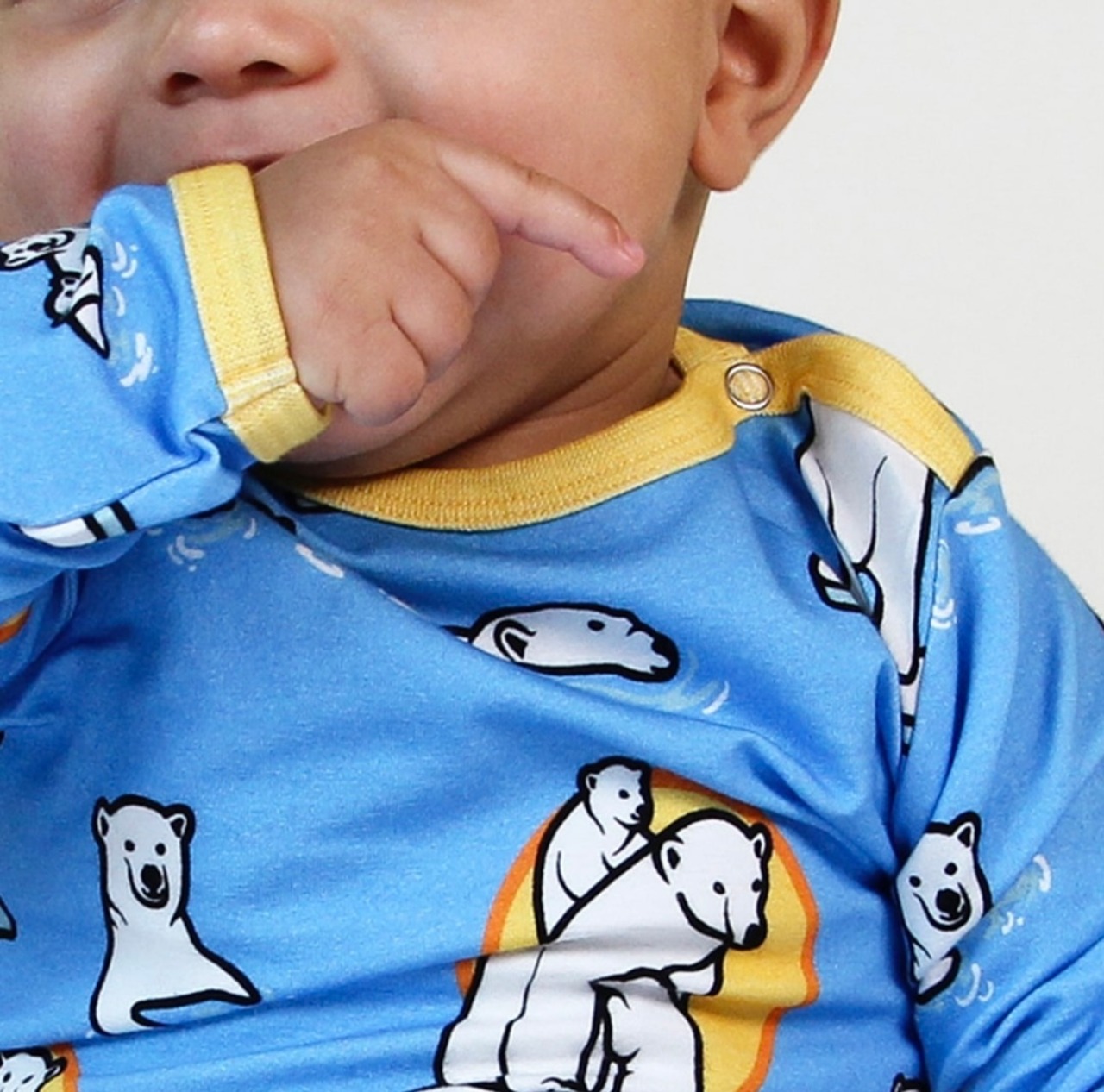 オーガニックで伸縮性のあるコットンジャージで作られたホッキョクグマの長袖ベビーボディ。