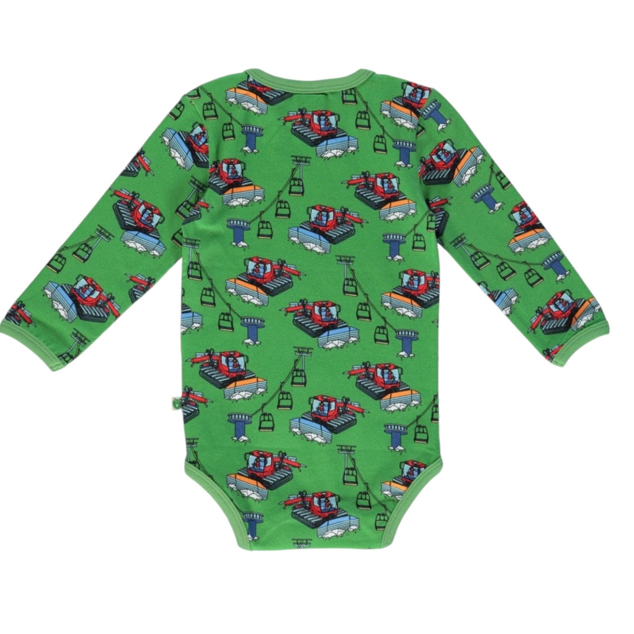 オーガニックで伸縮性のあるコットンジャージで作られた、スノーキャットの長袖ベビーボディ。