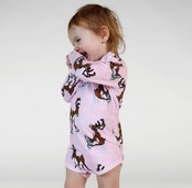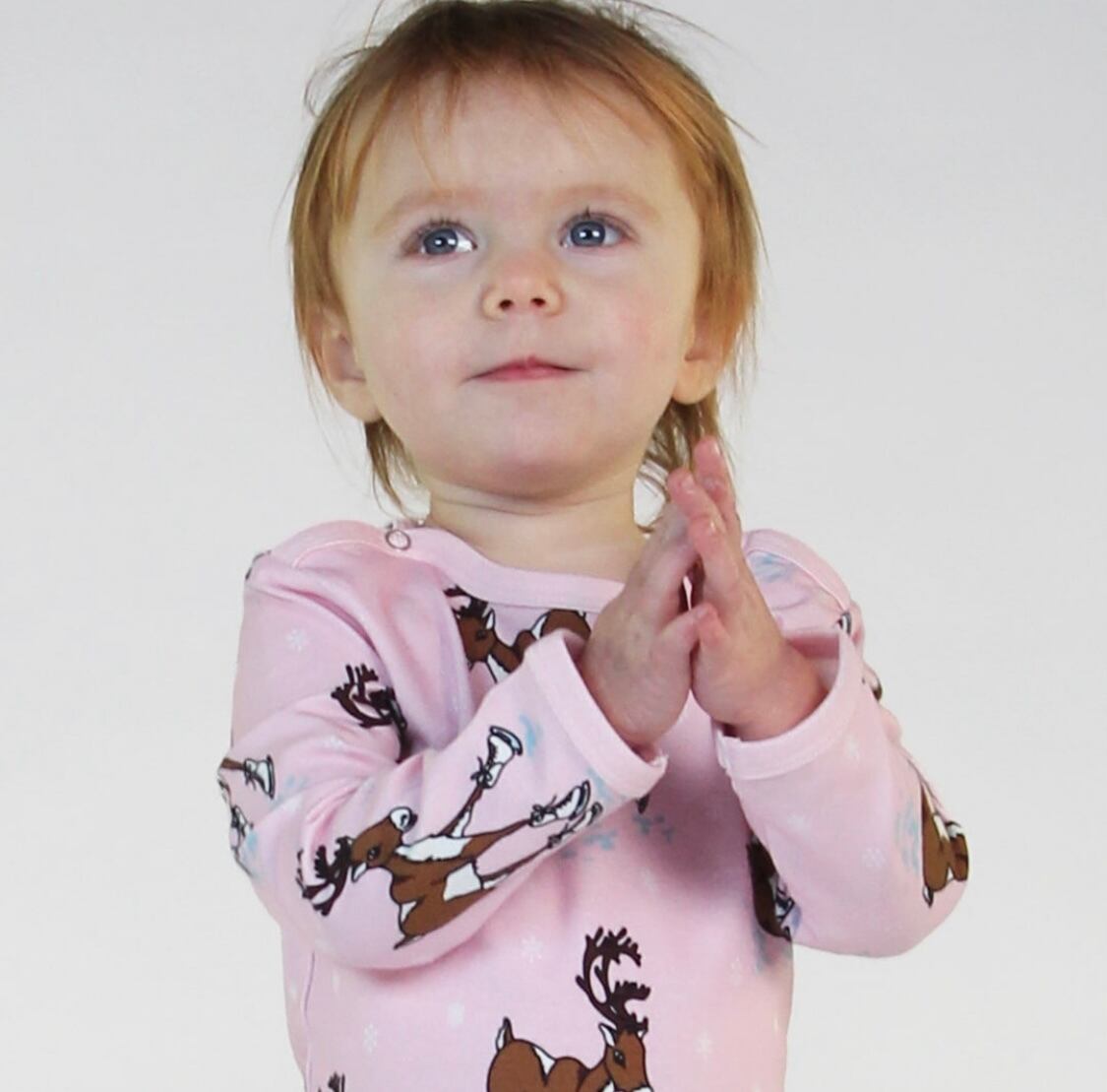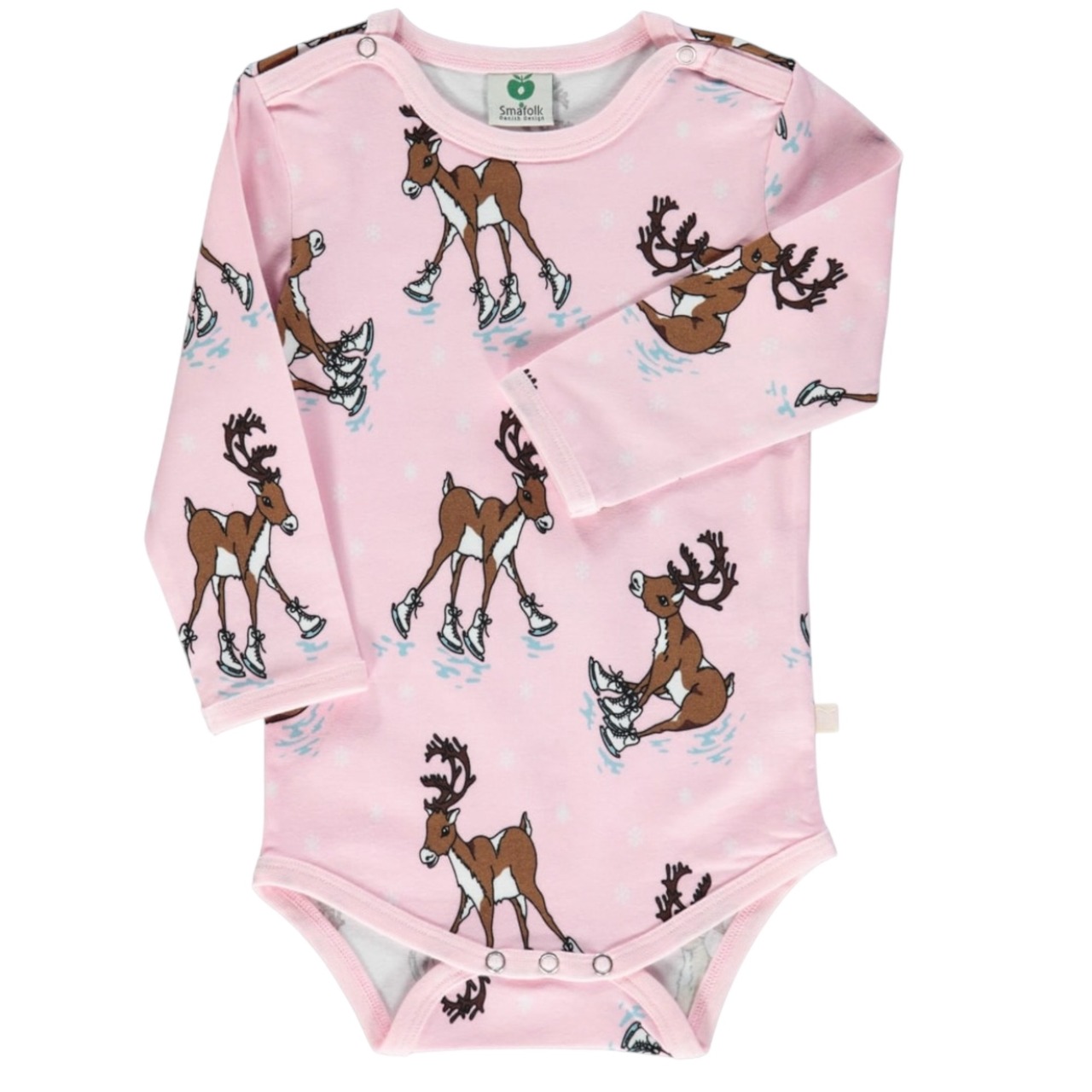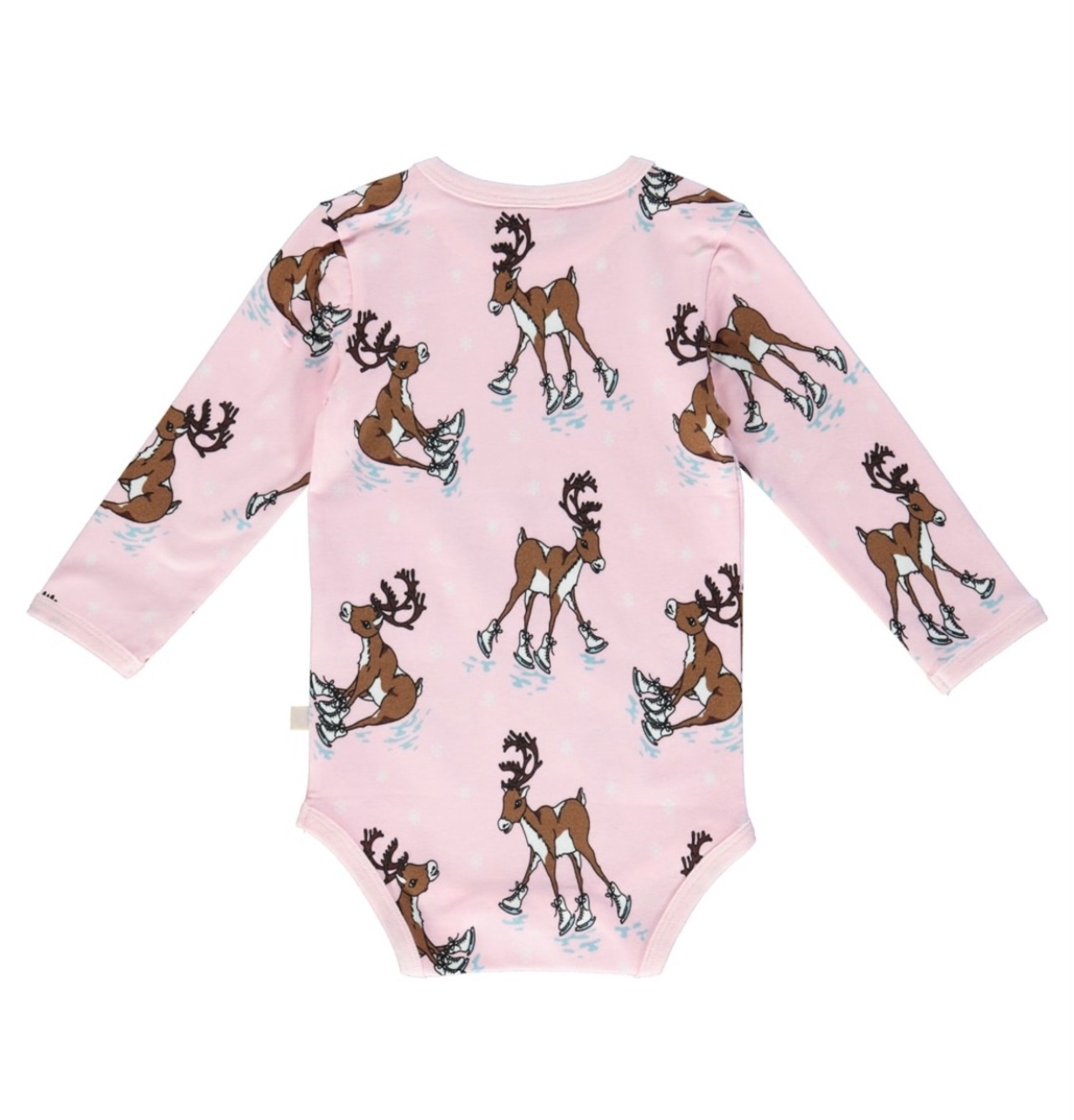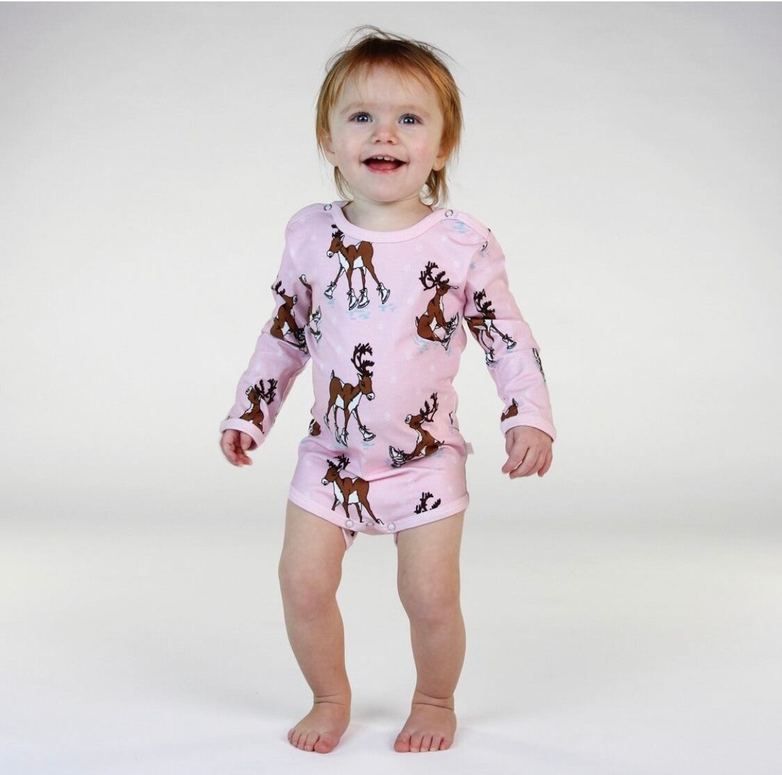 オーガニックで伸縮性のあるコットンジャージで作られた、トナカイの長袖のベビーボディ。