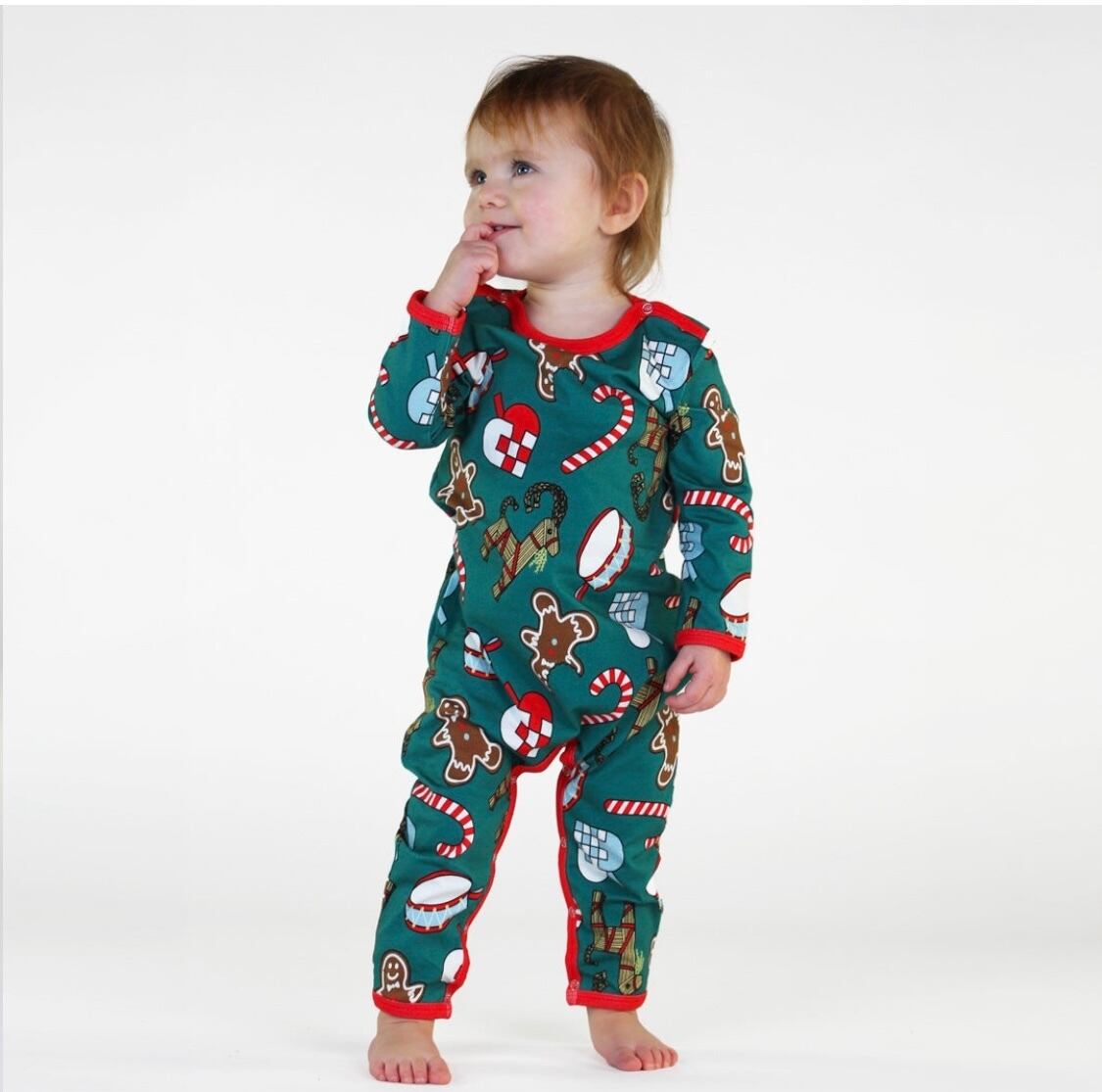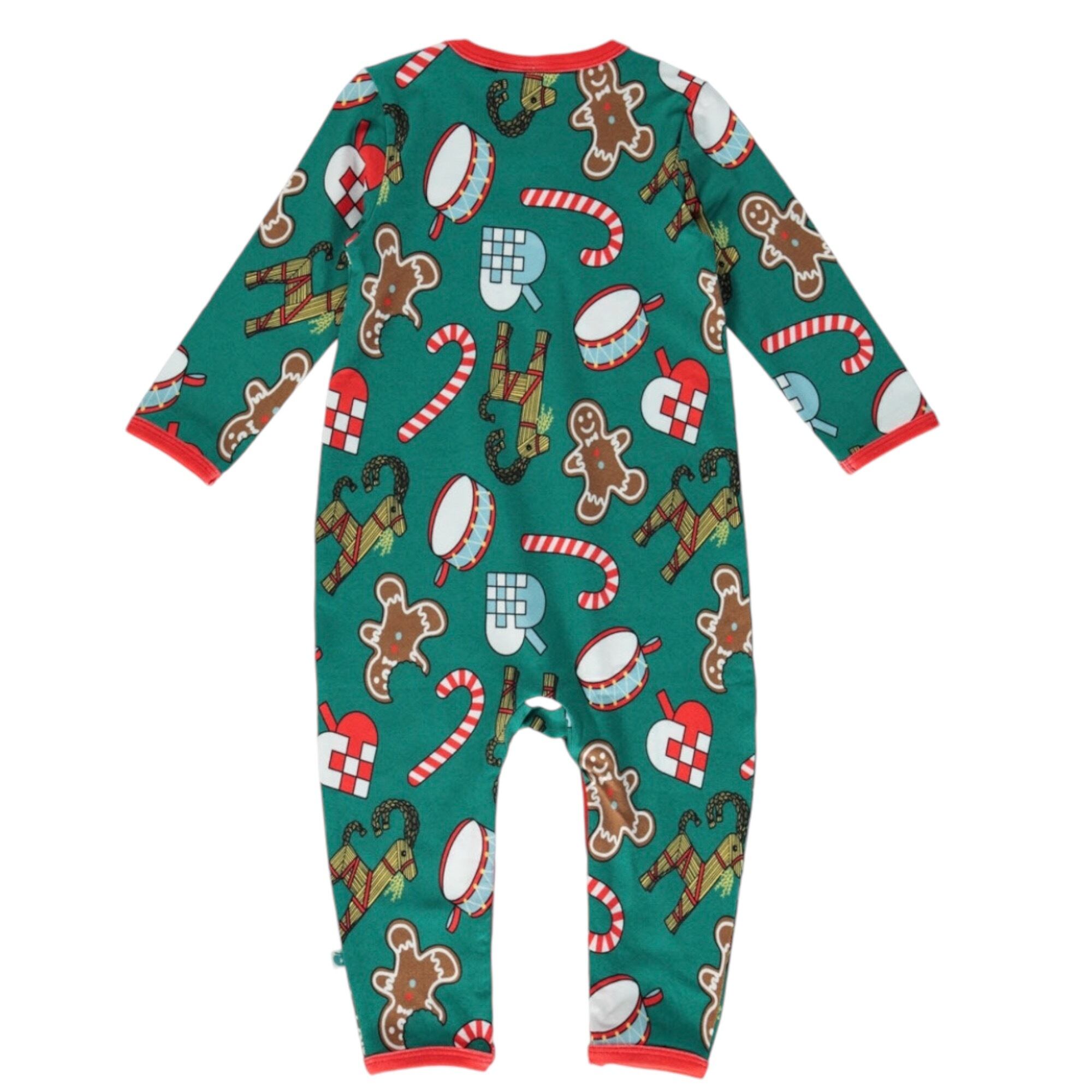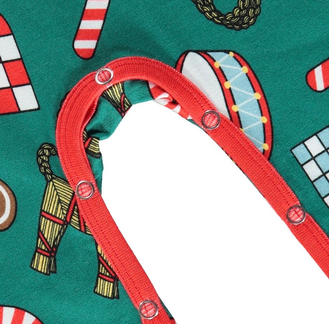 オーガニックで伸縮性のあるコットンジャージで作られた、クリスマスデコレーションの長袖ボディースーツ。