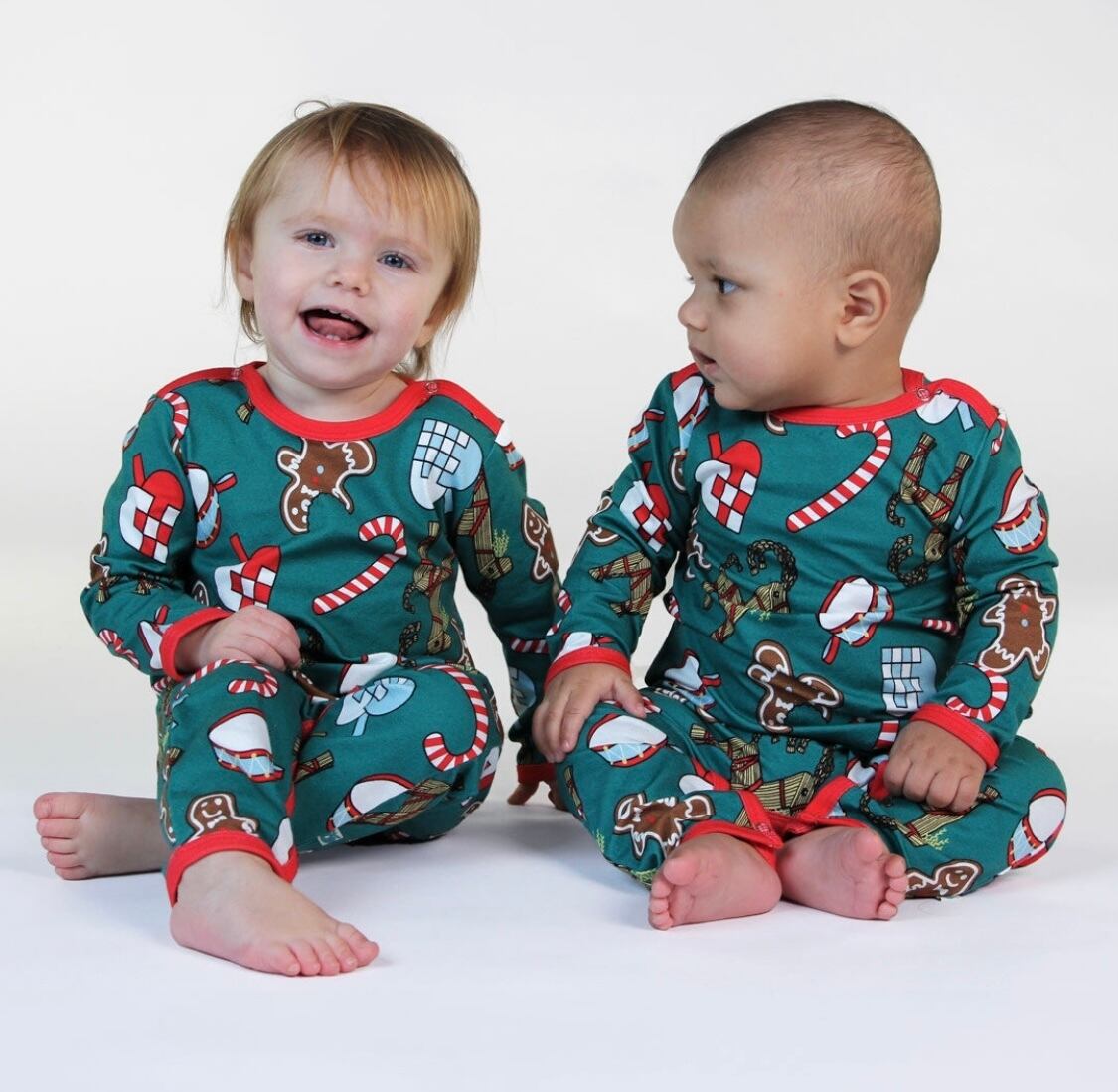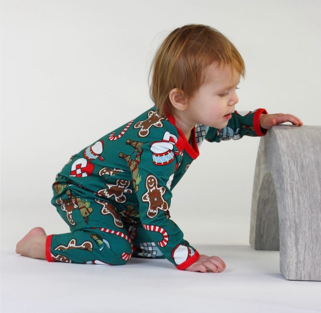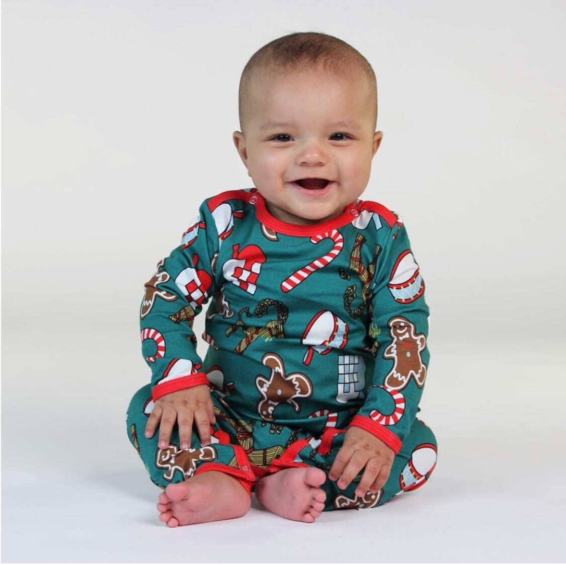 オーガニックで伸縮性のあるコットンジャージで作られた、クリスマスデコレーションの長袖ボディースーツ。