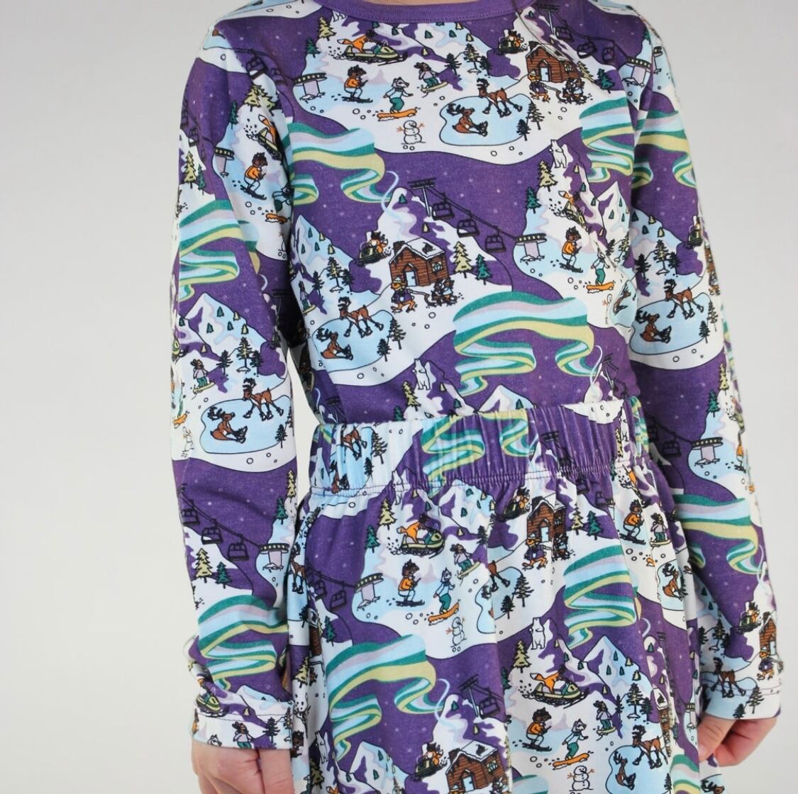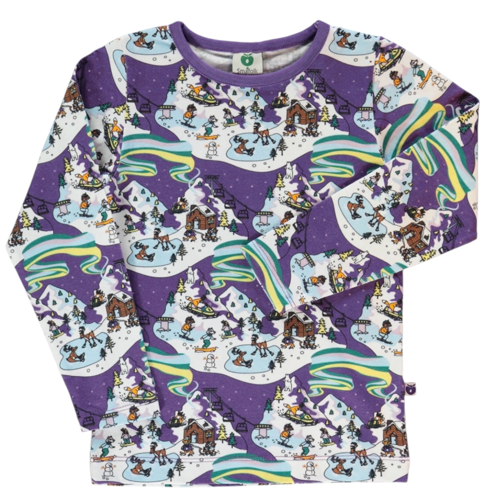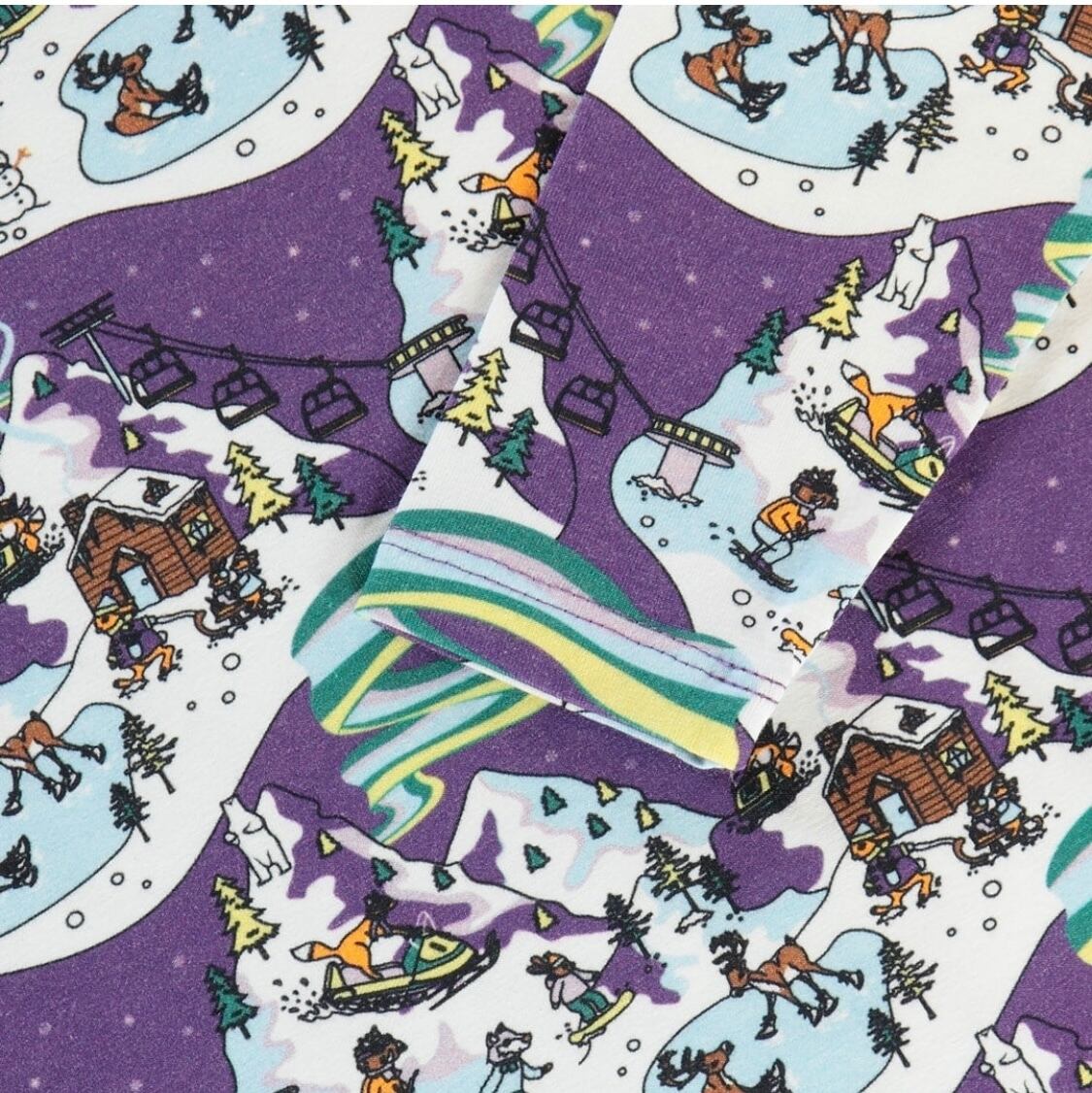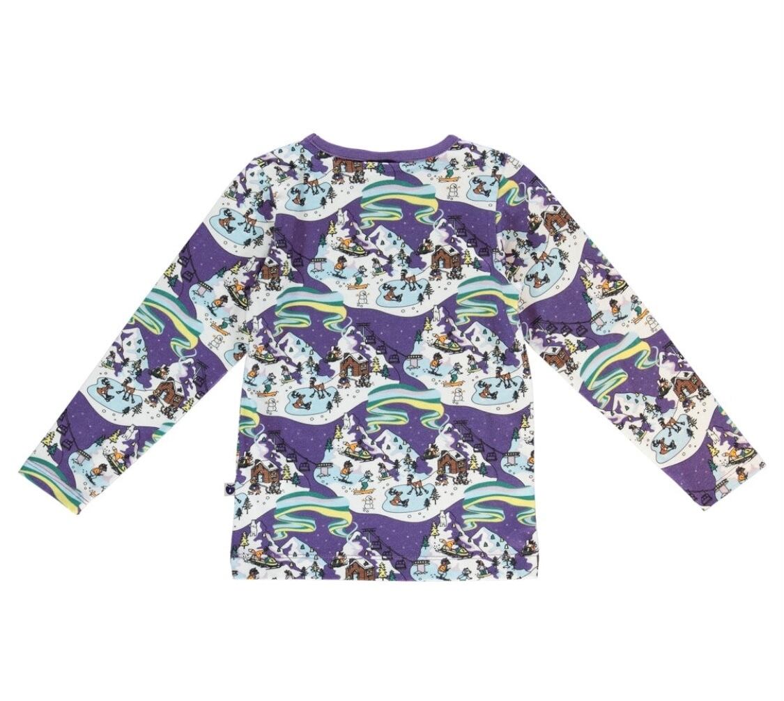 オーガニックで伸縮性のあるコットンジャージーで作られた冬の風景の長袖Tシャツ。