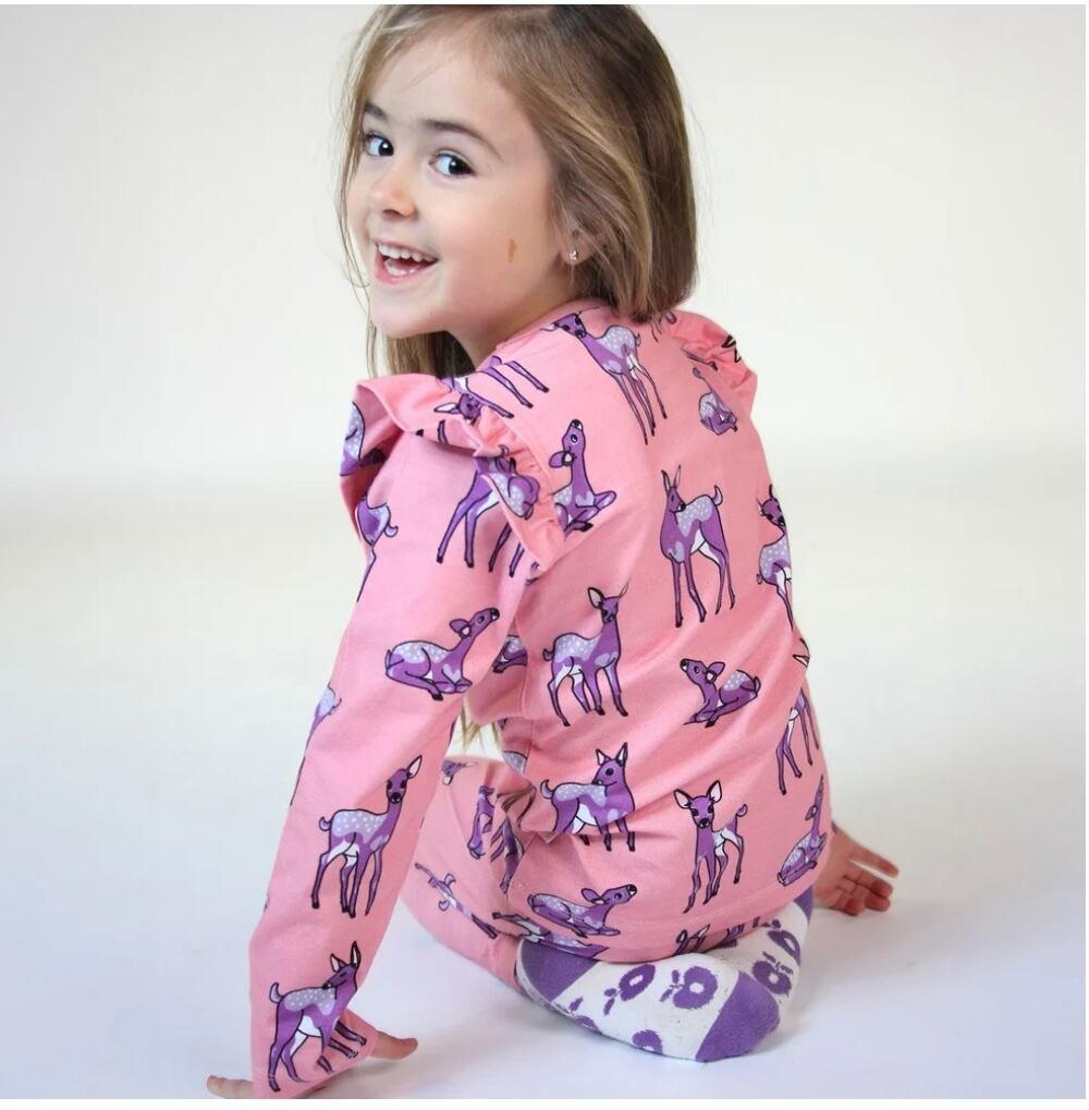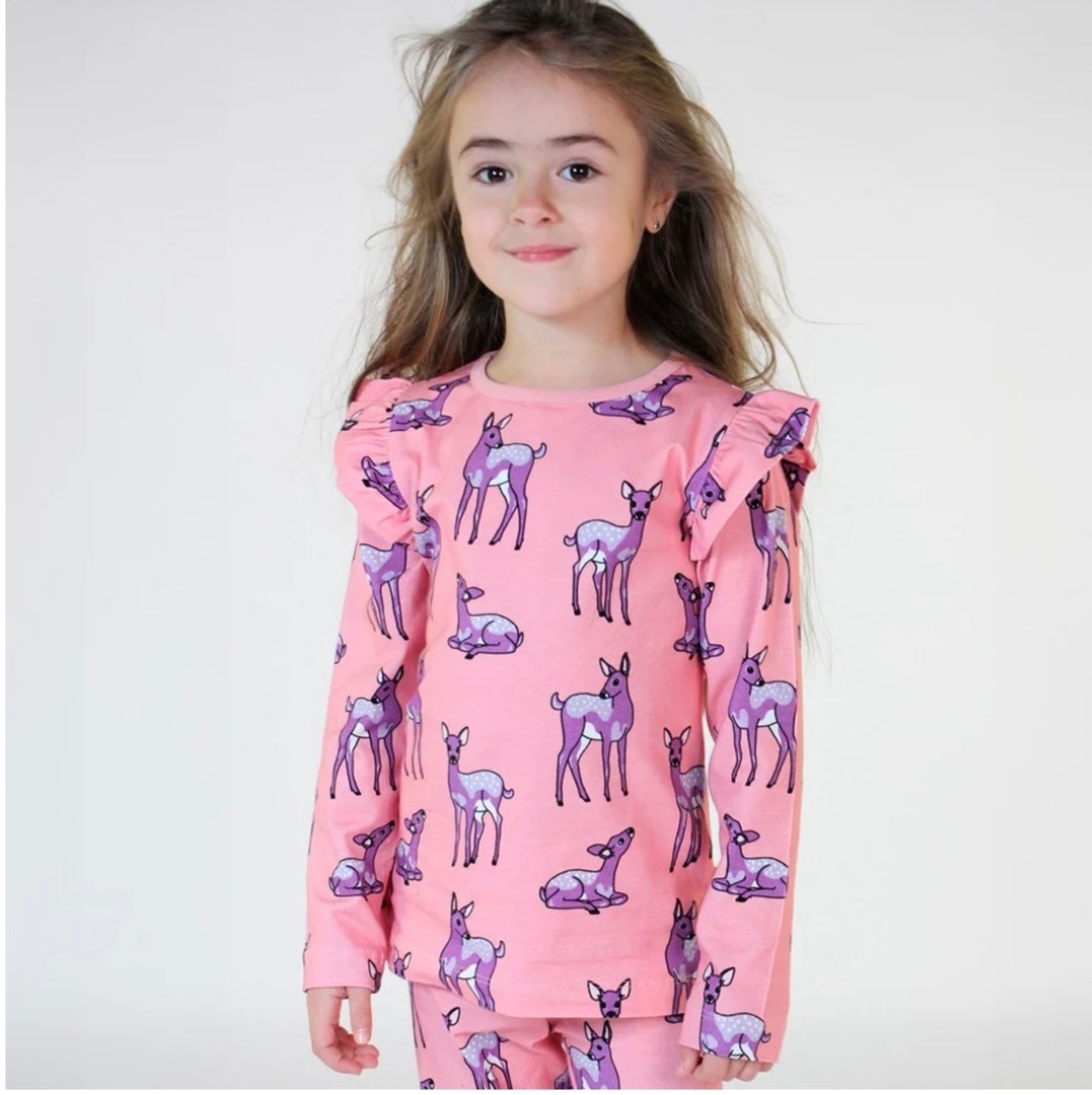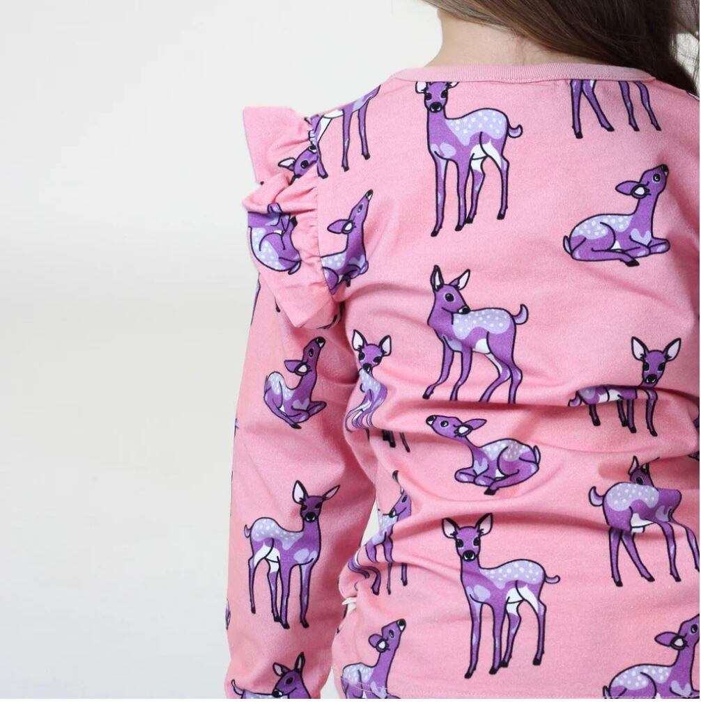オーガニックで伸縮性のあるコットンジャージーで作られた鹿の長袖Tシャツ。