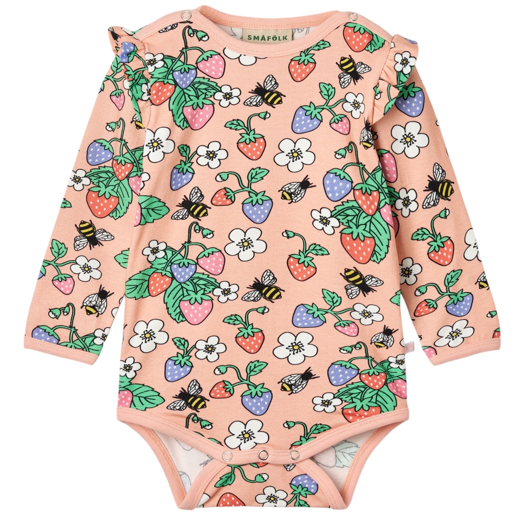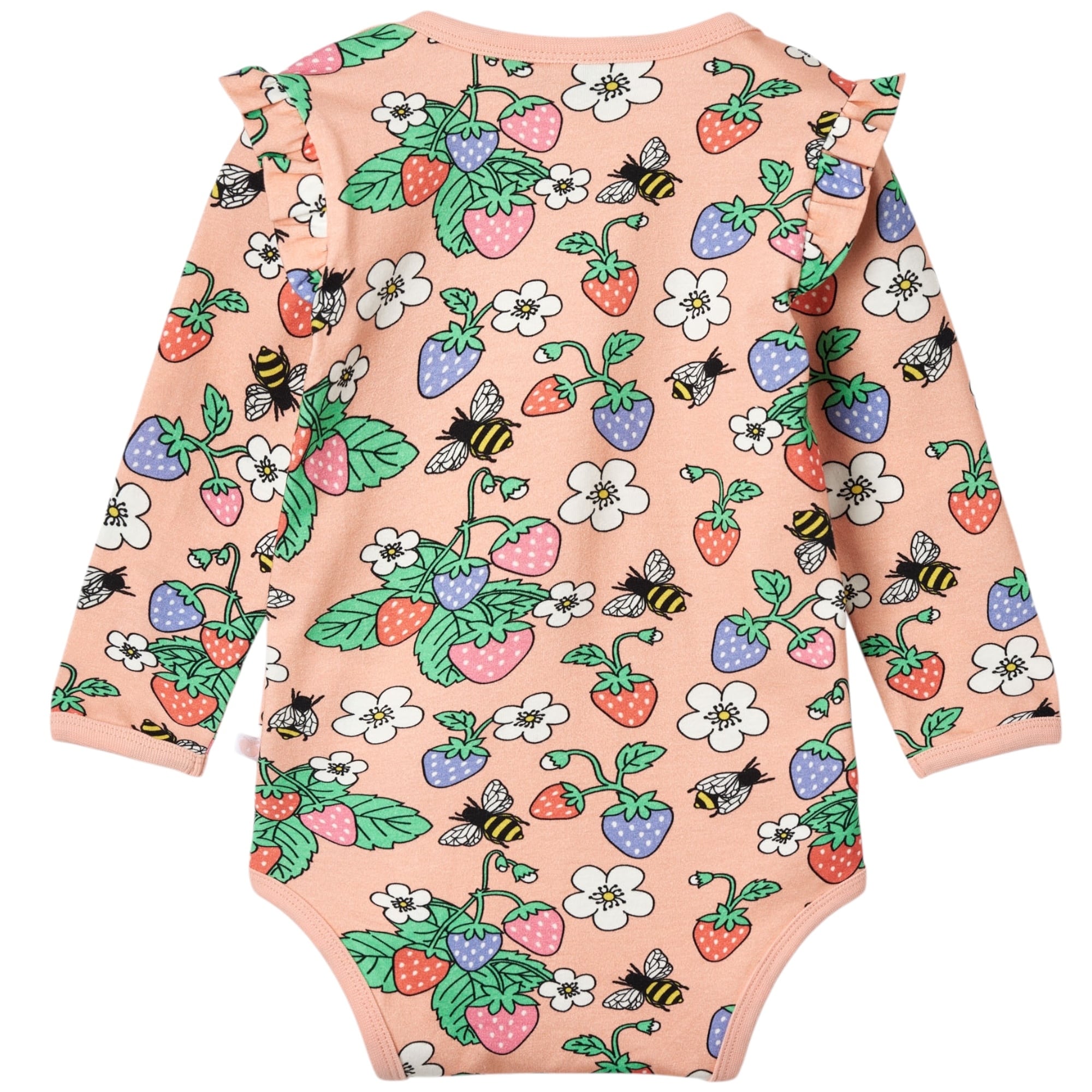 オーガニックコットンを使用した、やわらかく伸縮性のあるロングスリーブボディです。いちごのデザインがキュートで、元気いっぱいの赤ちゃんにぴったりな一着です。