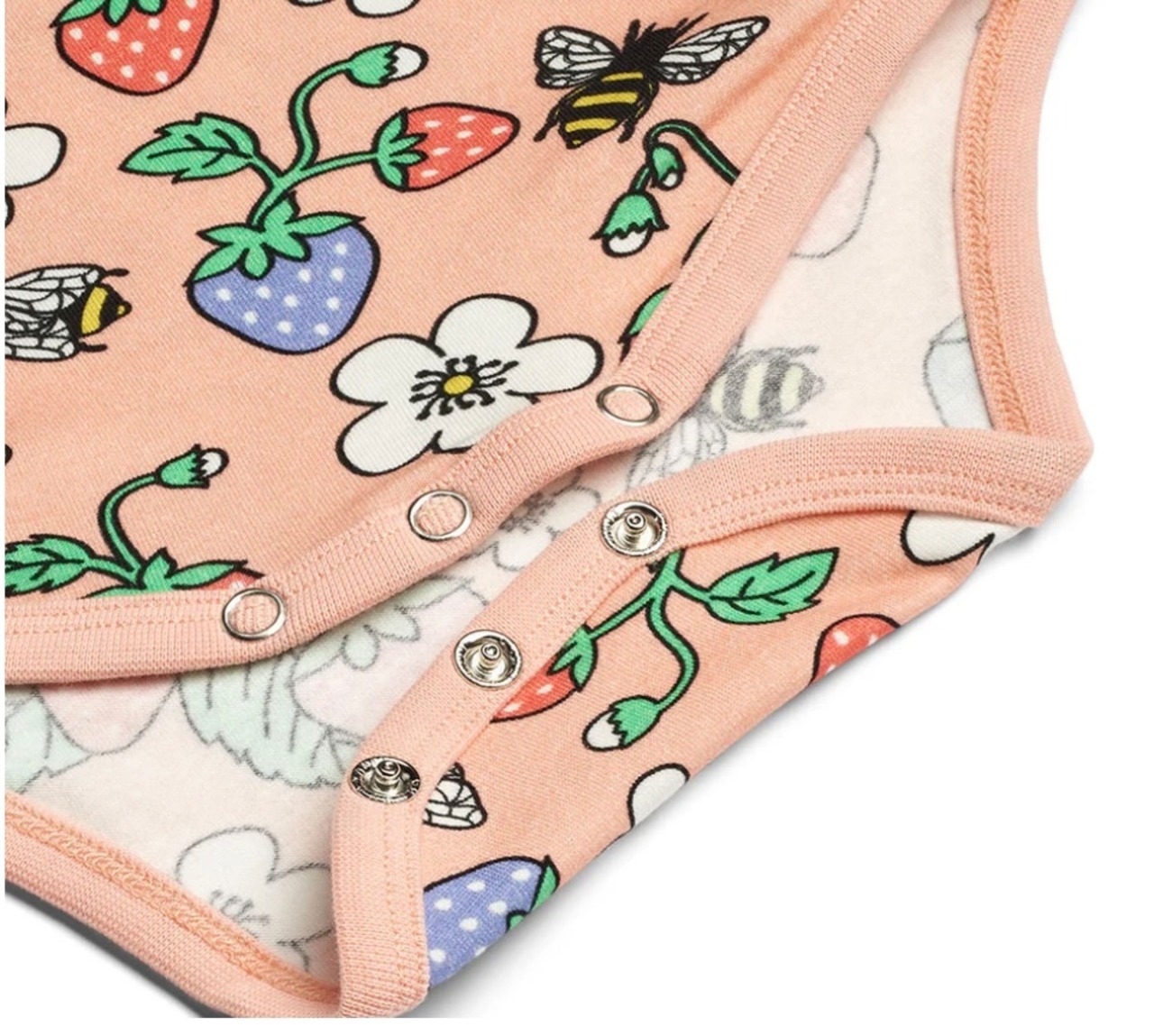北欧デザインの魅力が詰まったこのブランドは、ビビッドな色遣いとレトロなテキスタイルが特徴です。かわいらしいいちご柄のロンパースは、赤ちゃんの可愛さを引き立て、楽しい気分にさせてくれます!
